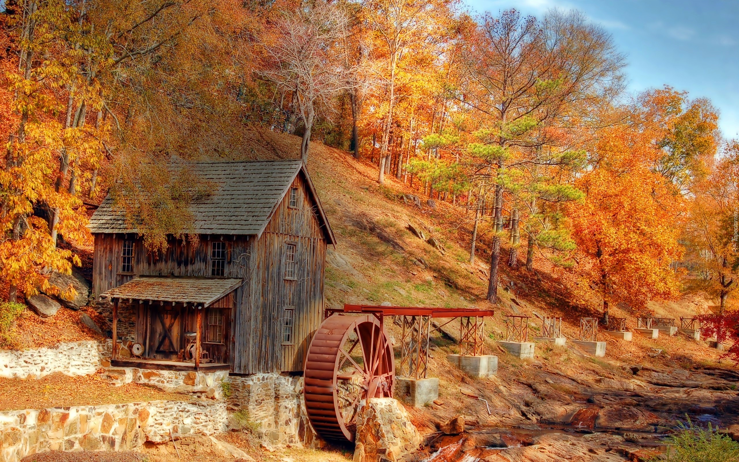 Edytor tapety: Młyn, Wodny, Jesień, Las, Wzgórze