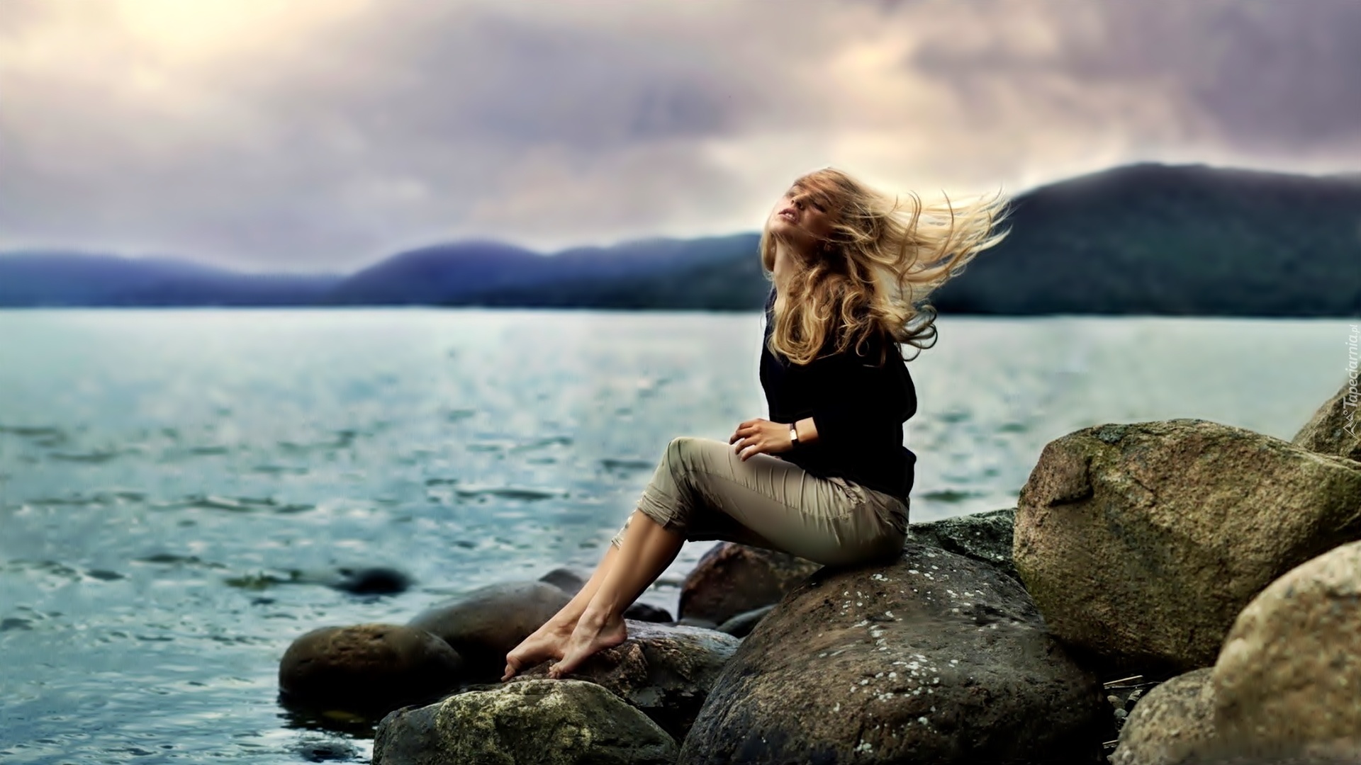 Edytor tapety: Jezioro, Góry, Kamienie, Kobieta, Rozwiane, Włosy
