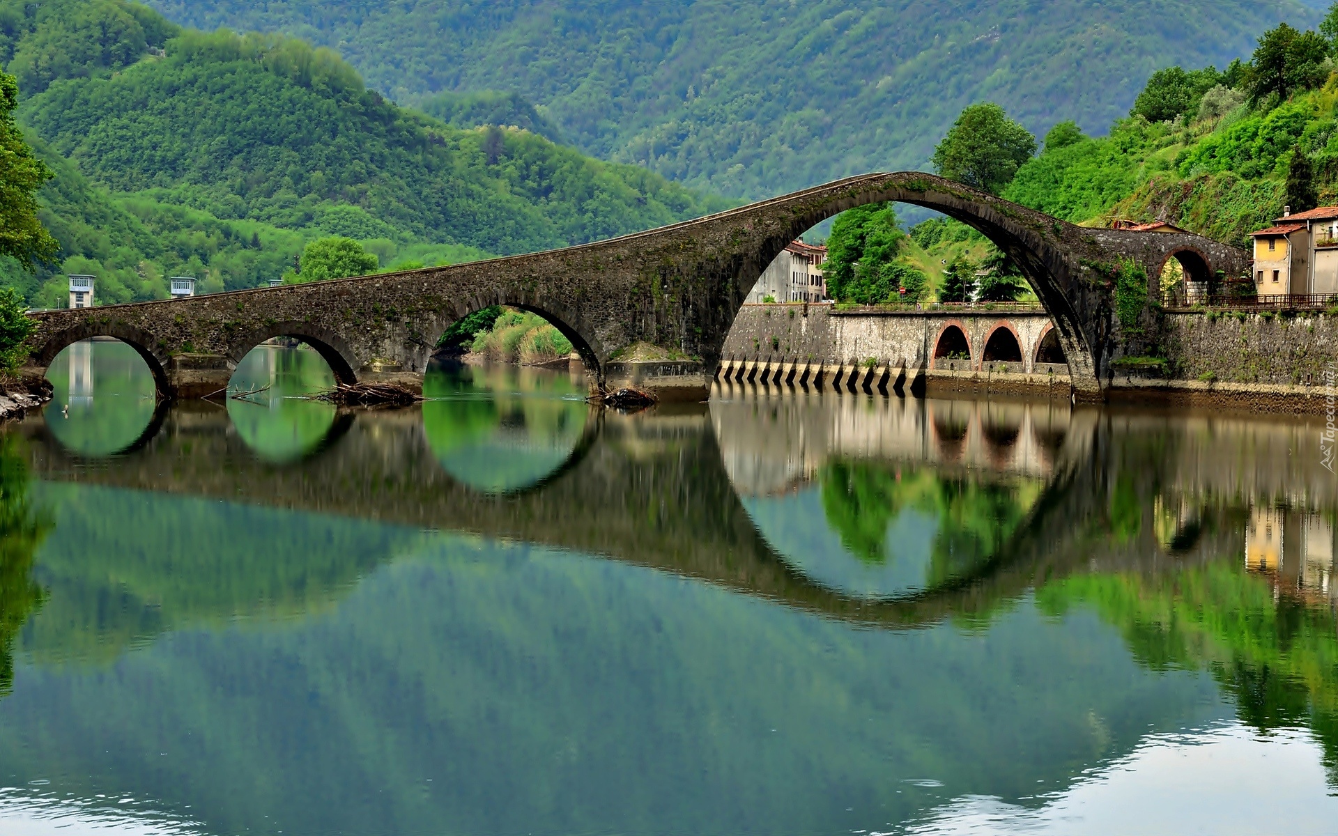Edytor tapety: Włochy, Rzeka, Most, Góry, Las