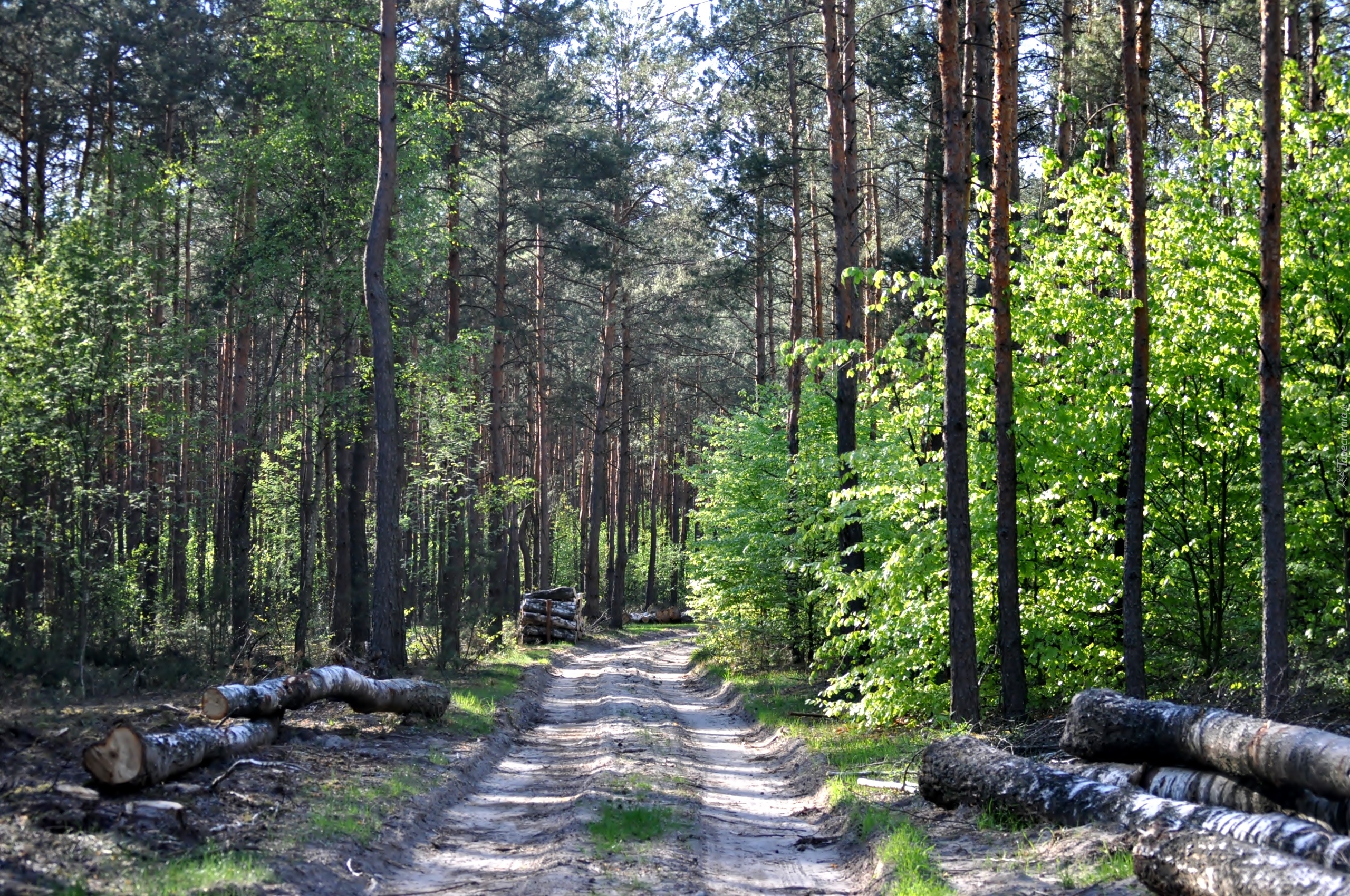 Edytor tapety: Las, Droga, Kłody, Drzewa