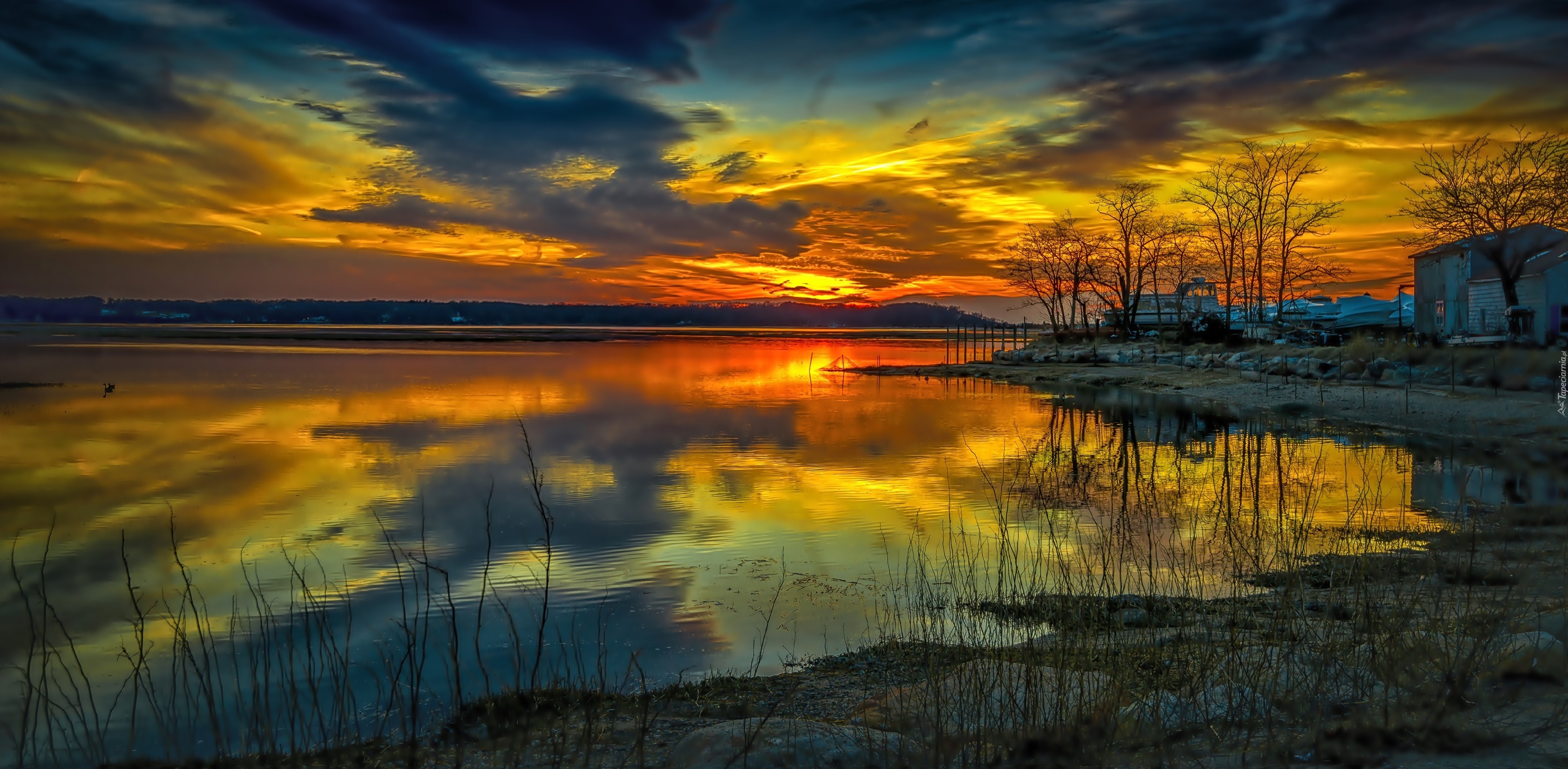 Edytor tapety: Dom, Jezioro, Zachód Słońca