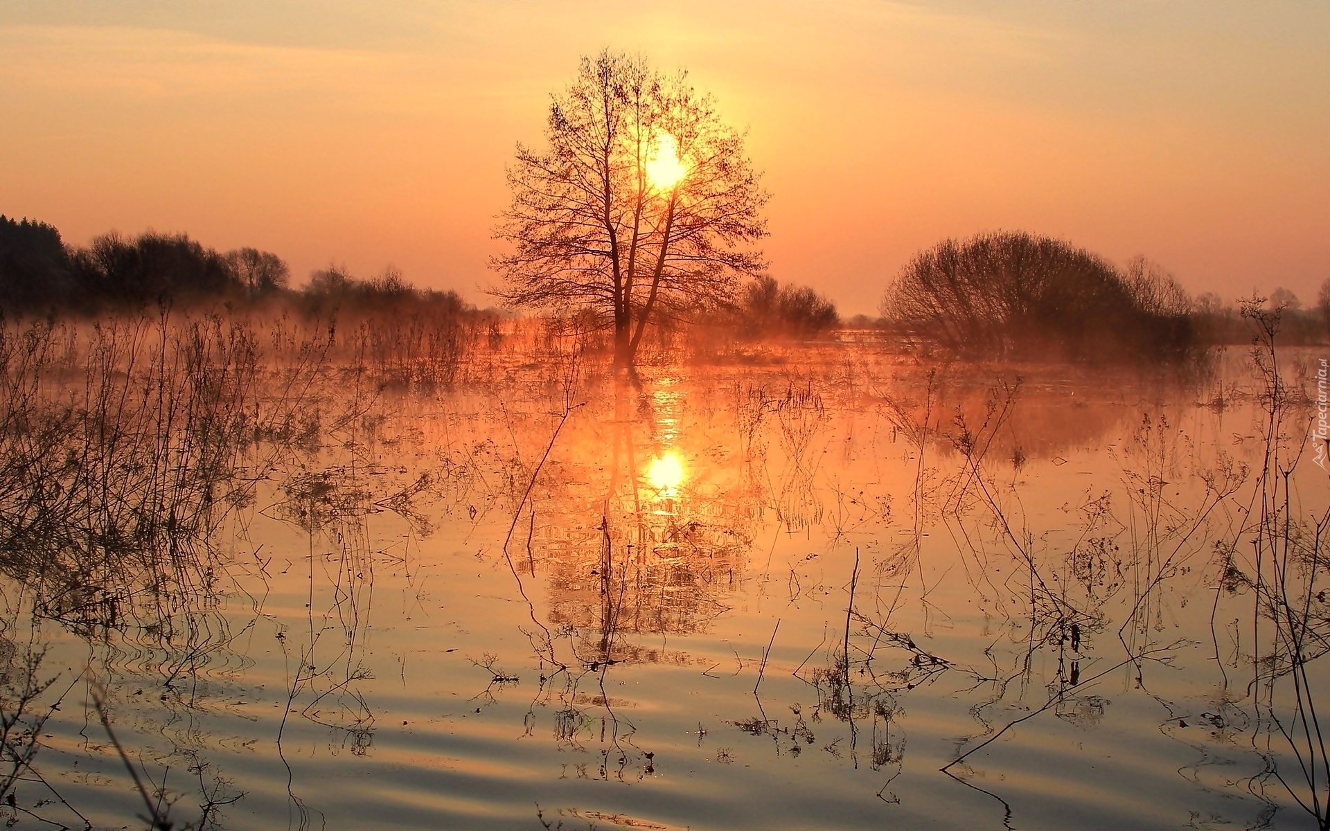 Edytor tapety: Jezioro, Mgła, Wschód słońca