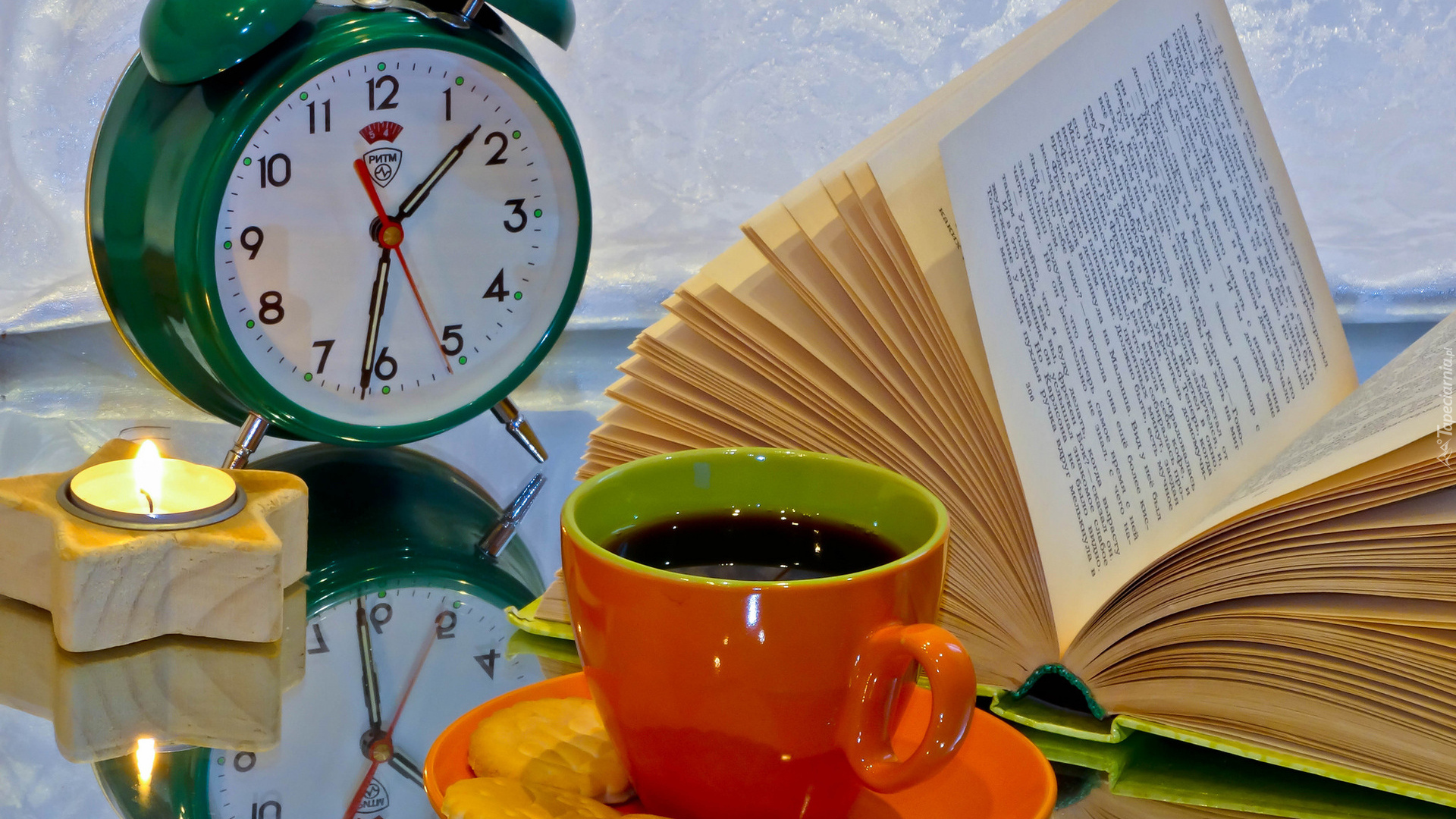 Edytor tapety: Książka, Filiżanka, Herbata, Świeca, Budzik