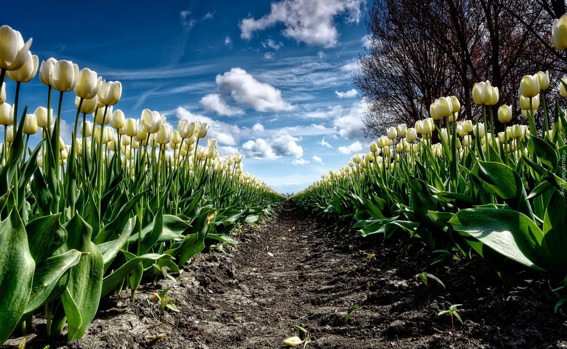 Edytor tapety: Białe, Tulipany, Plantacja, Drzewo