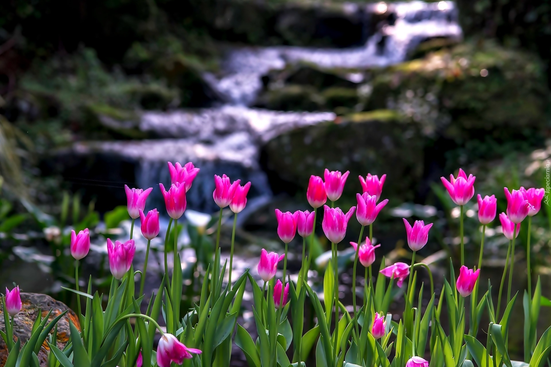 Edytor tapety: Różowe, Tulipany, Górska, Rzeka
