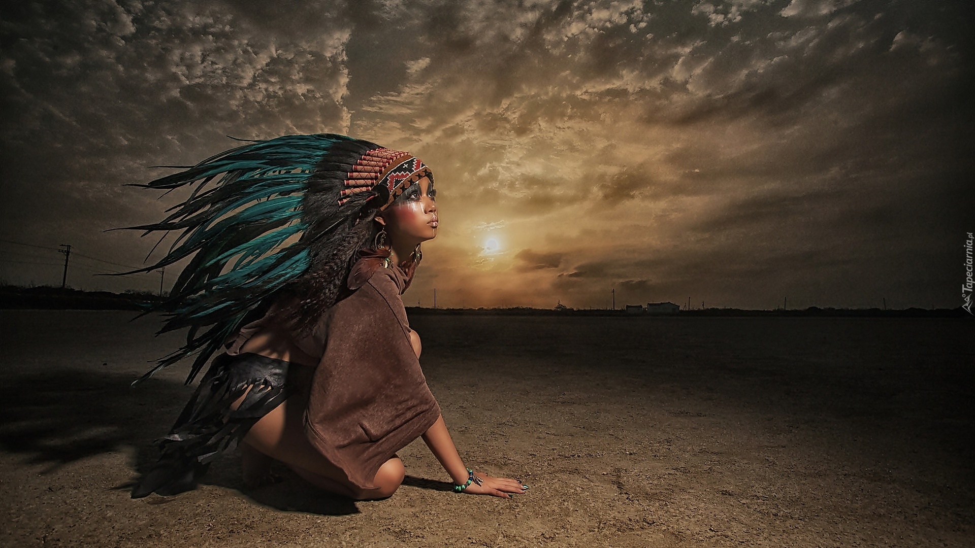Edytor tapety: Dziewczyna, Indianka, Zachód Słońca, Pióropusz