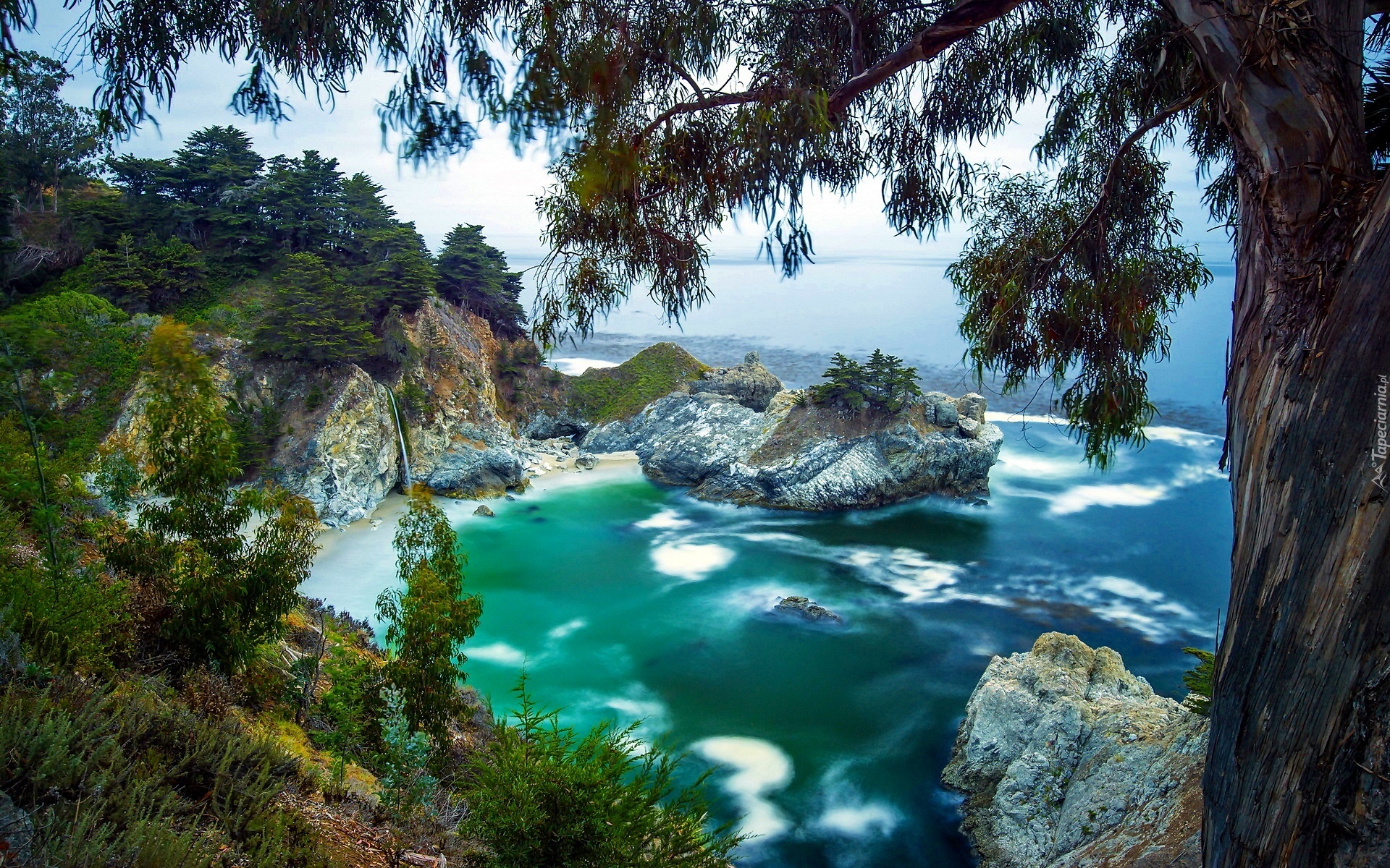 Edytor tapety: Ocean, Pacyfik, Wybrzeże, Skały, Wodospad, Drzewo