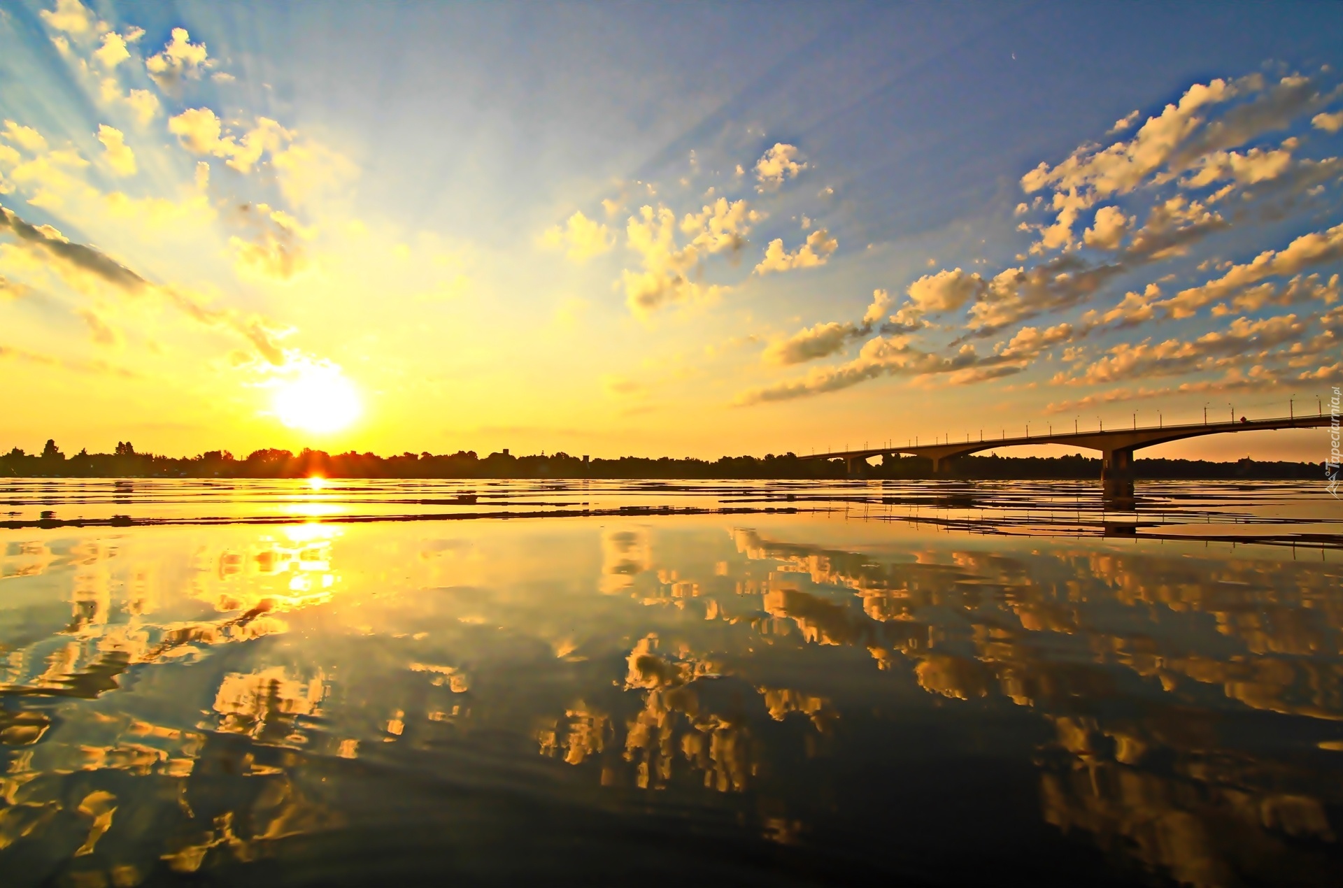 Edytor tapety: Wschód Słońca, Rzeka, Most, Chmury, Odbicie