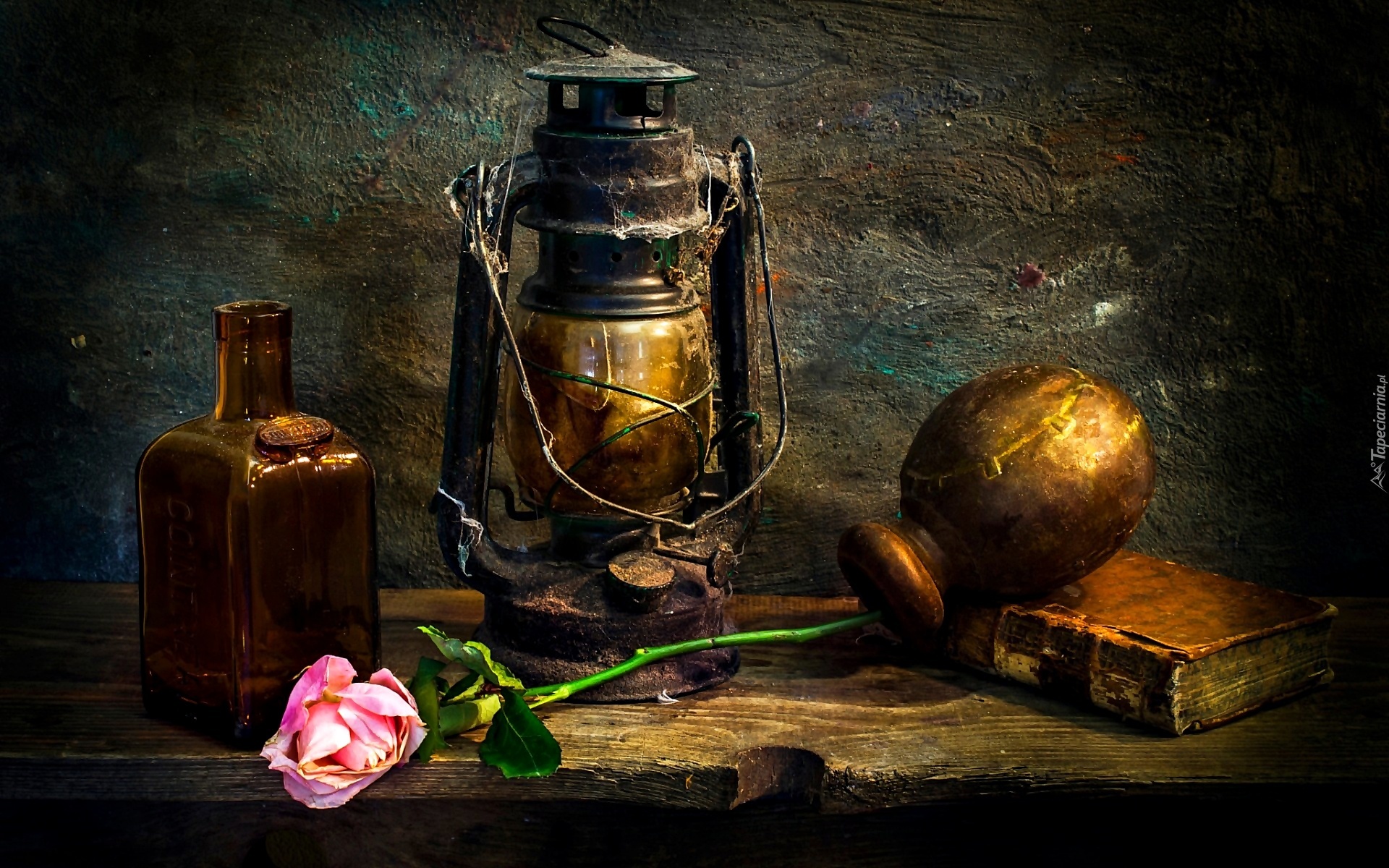 Edytor tapety: Kompozycja, Książka, Lampa, Naftowa, Butelka, Róża