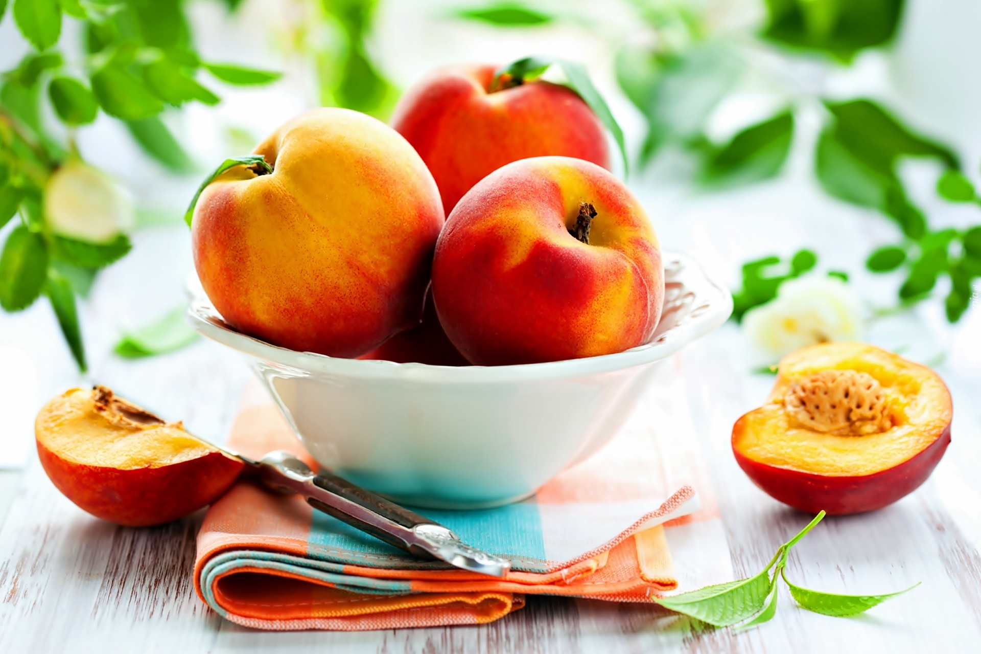 Edytor tapety: Brzoskwinie, Miseczka, Rozmycie