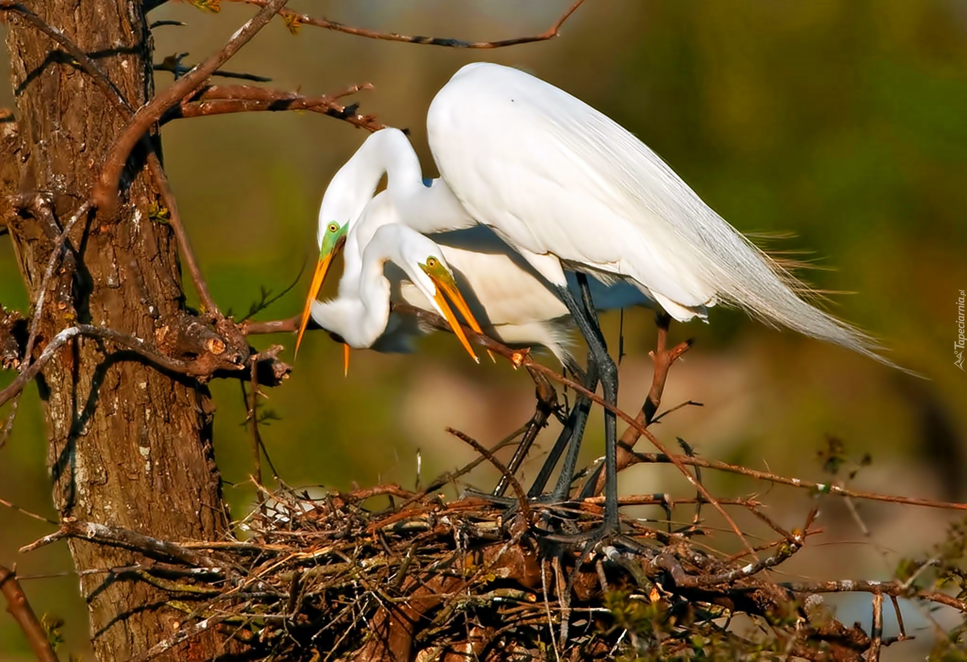 Edytor tapety: Czapla, Biała, Para, Drzewo, Gniazdo