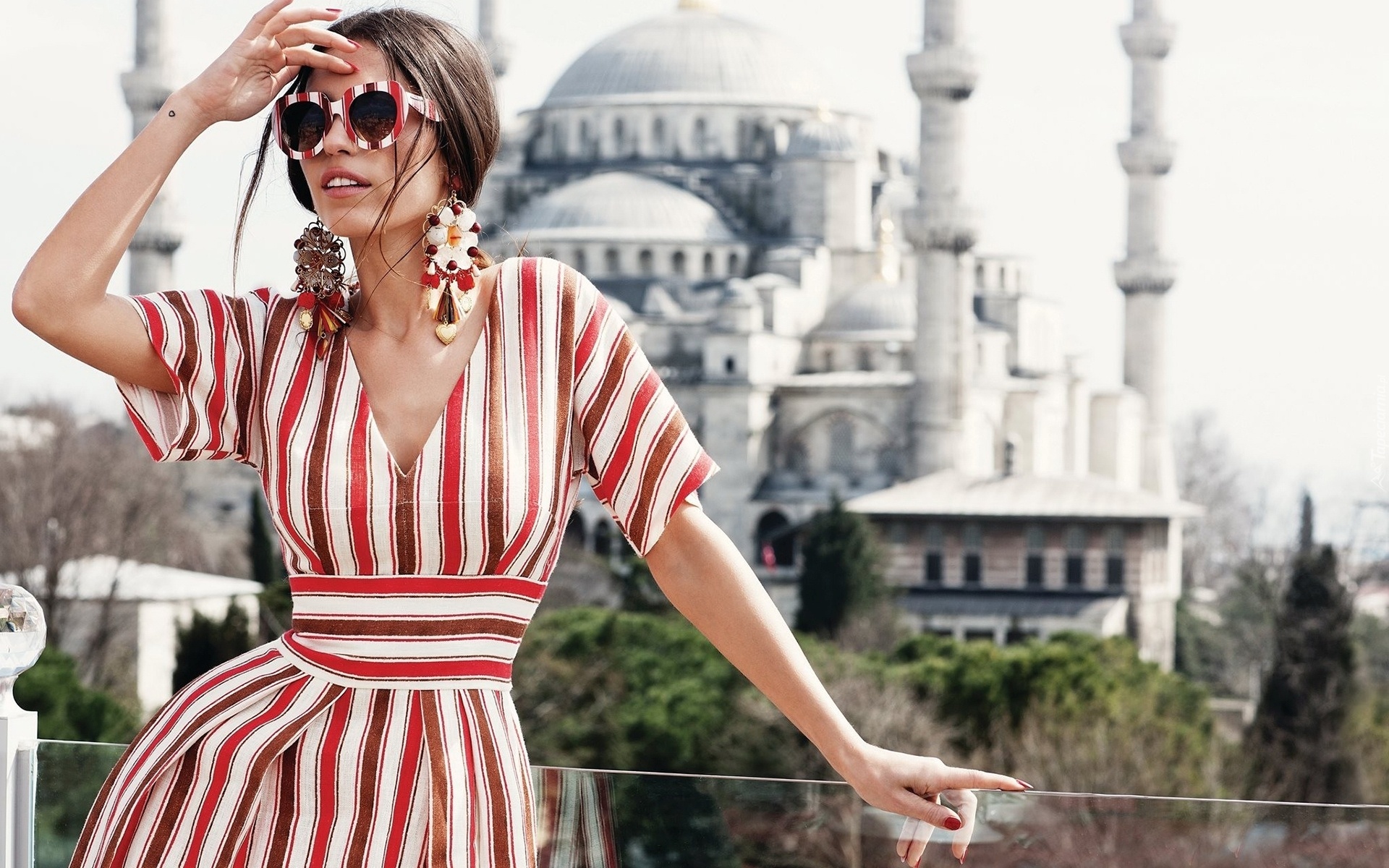 Edytor tapety: Kobieta, Yolanthe Sneijder, Brunetka, Okulary, Kolczyki, Sukienka