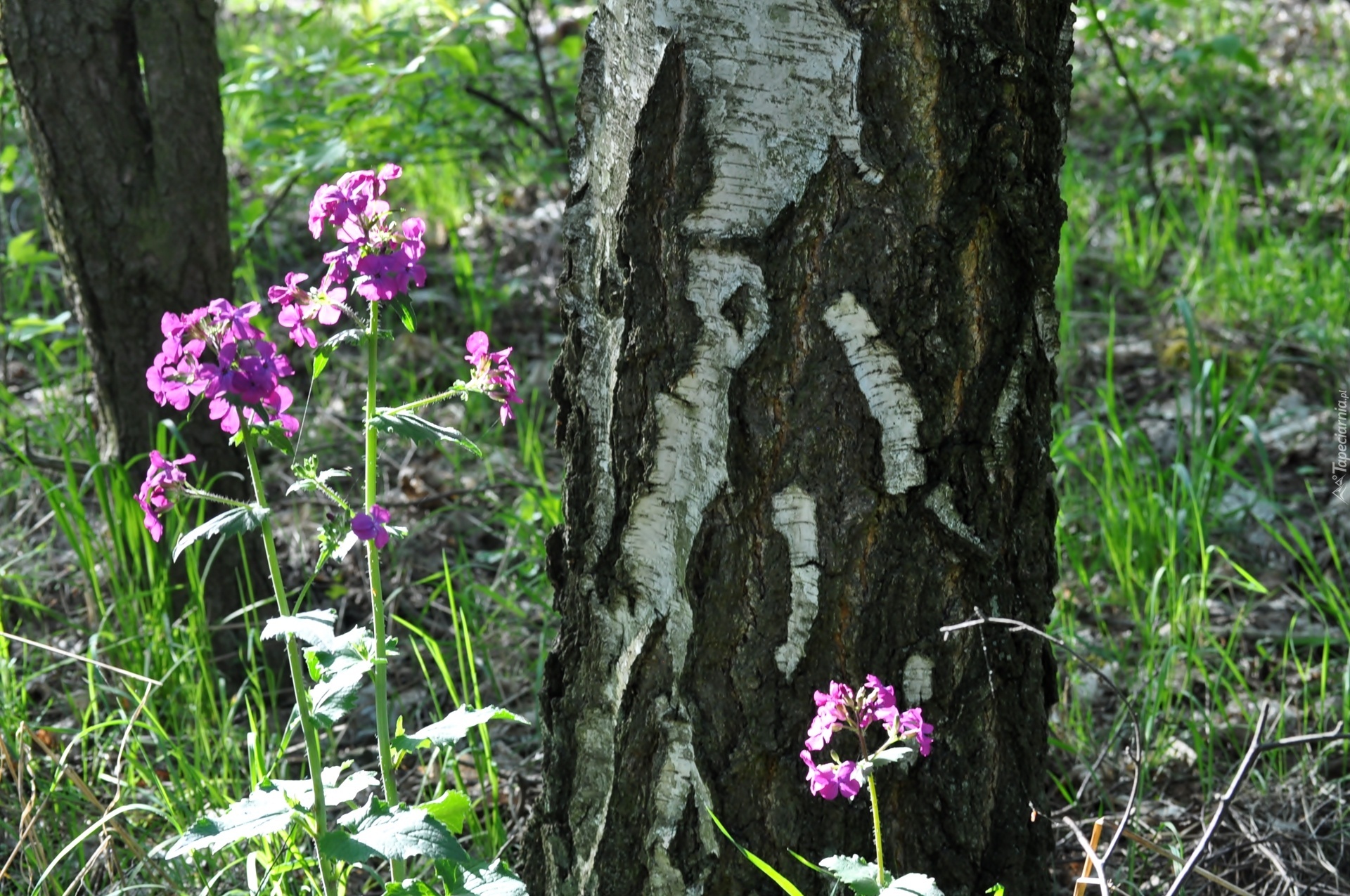 Edytor tapety: Purpurowe, Leśne, Kwiaty, Pień, Drzewa, Lunaria