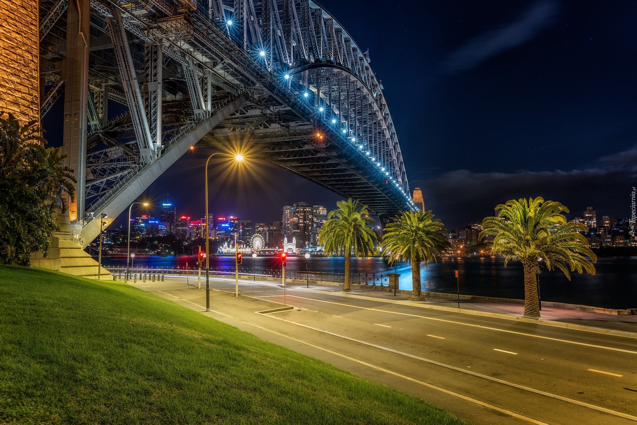 Edytor tapety: Australia, Sydney, Most, Noc, Rzeka, Droga, Światła, Palmy