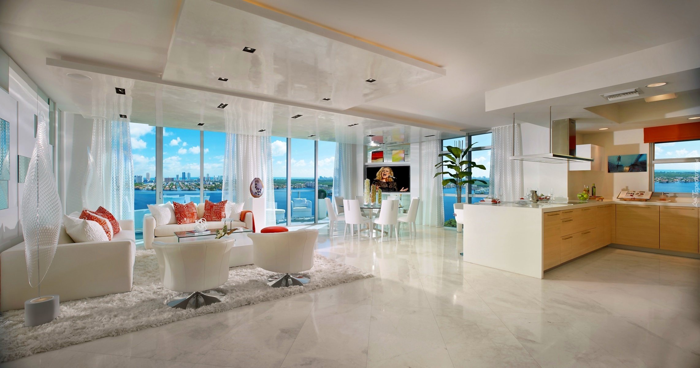 Edytor tapety: Biały, Pokój, Aneks, Kuchenny, Okna, Krajobraz