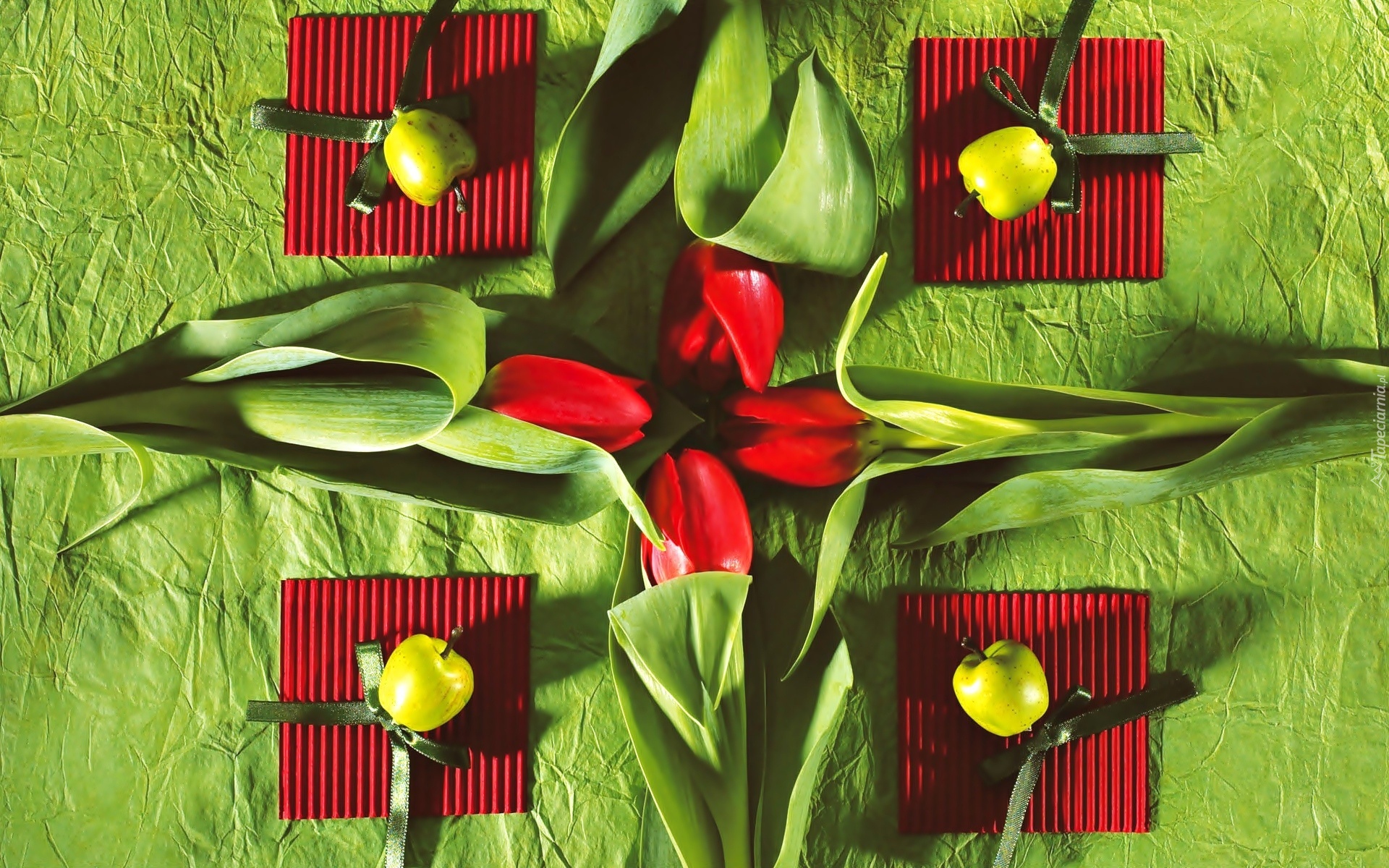 Edytor tapety: Kompozycja, Czerwone, Tulipany, Jabłka, Serwetki