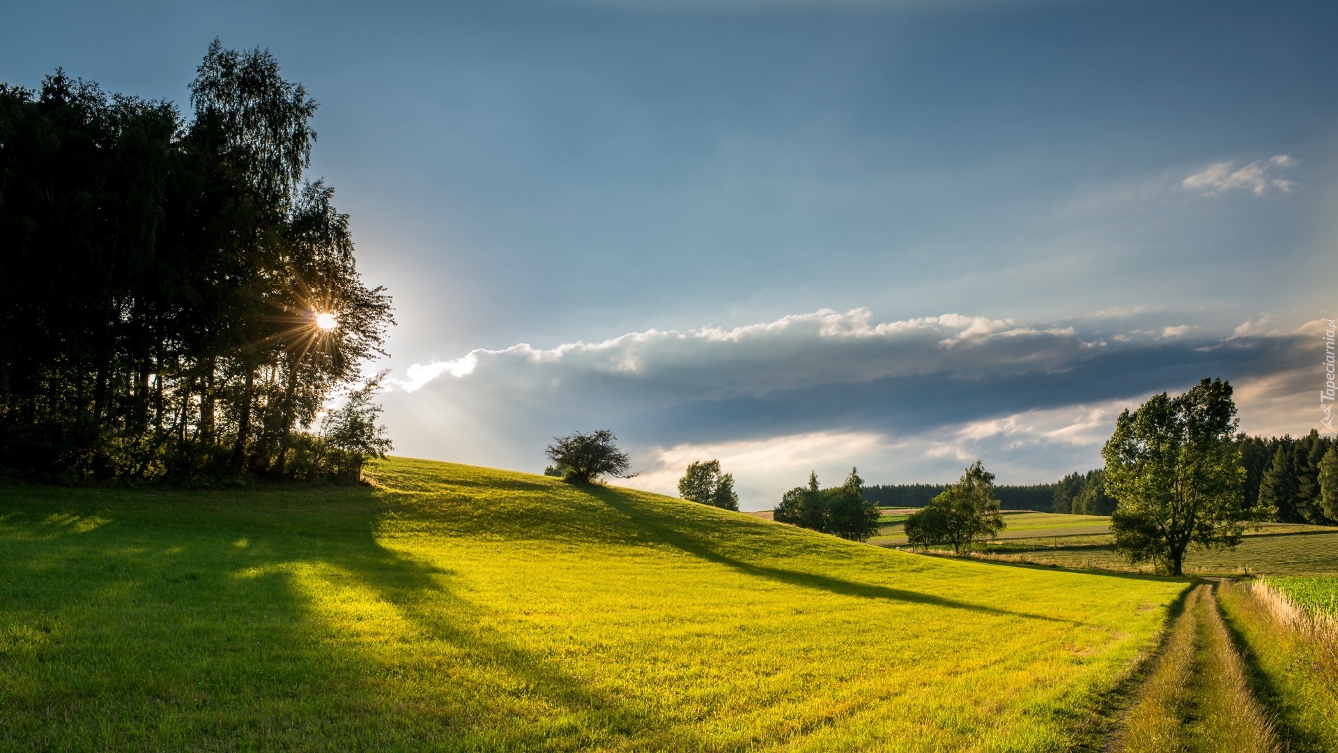 Edytor tapety: Wschód Słońca, Poranek, Polna Droga, Drzewa, Wzgórza