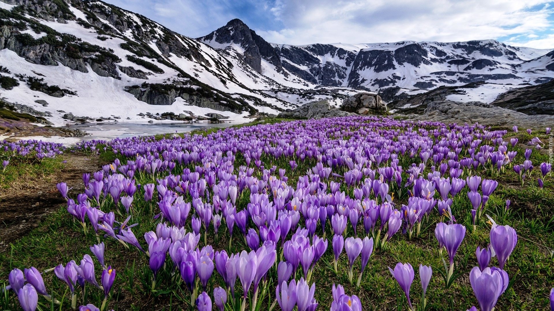 Edytor tapety: Krokusy, Ośnieżone, Góry