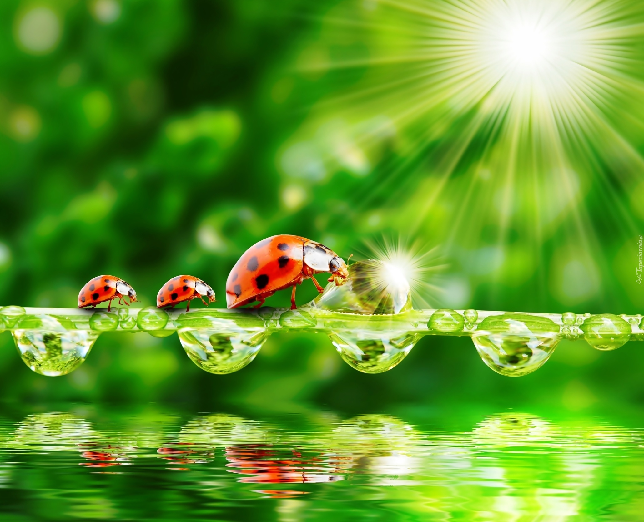 Edytor tapety: Biedronki, Krople, Wody, Promienie Słońca