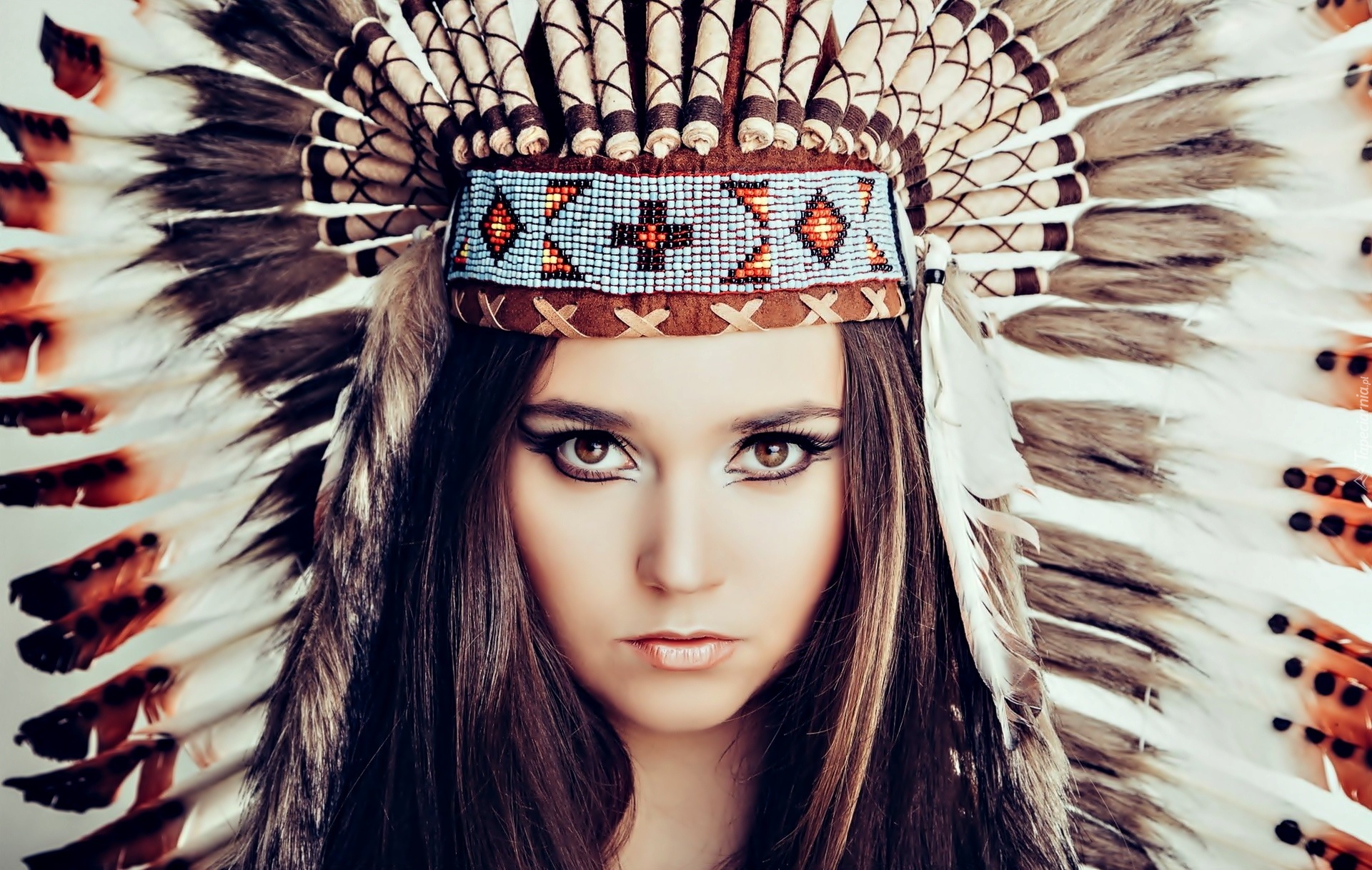 Edytor tapety: Kobieta, Twarz, Pióropusz, Indianka