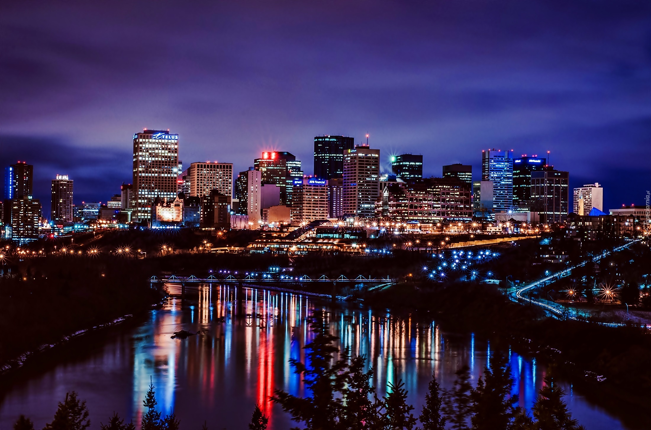 Edytor tapety: Drapacze Chmur, Rzeka, Most, Edmonton, Panorama, Miasta, Nocą