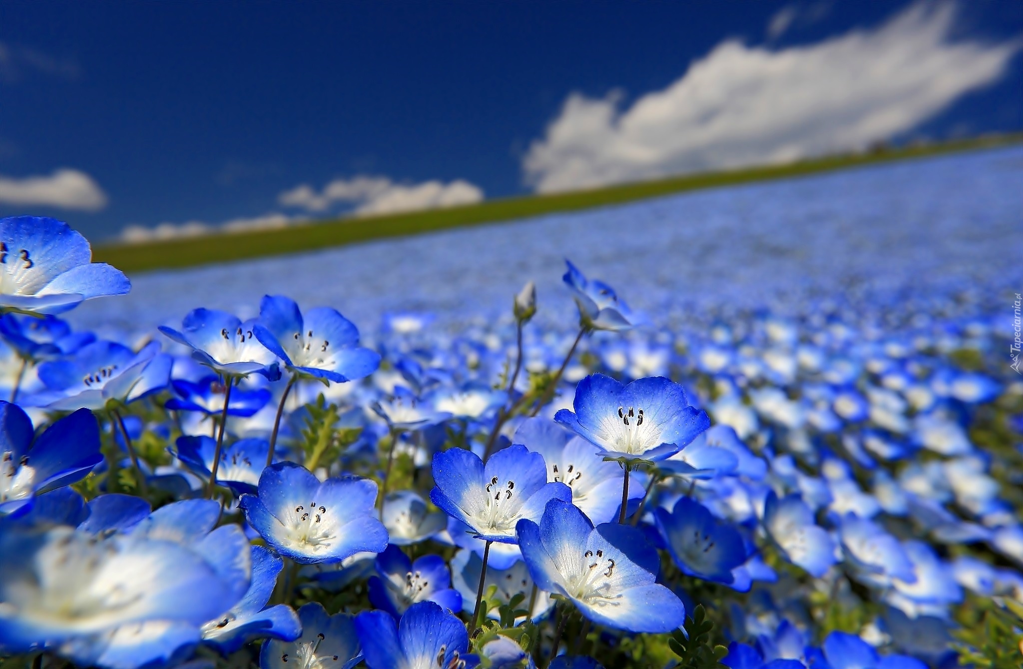 Edytor tapety: Niebieskie, Kwiaty, Porcelanka, Nemophila menziesii, Łąka, Krajobraz