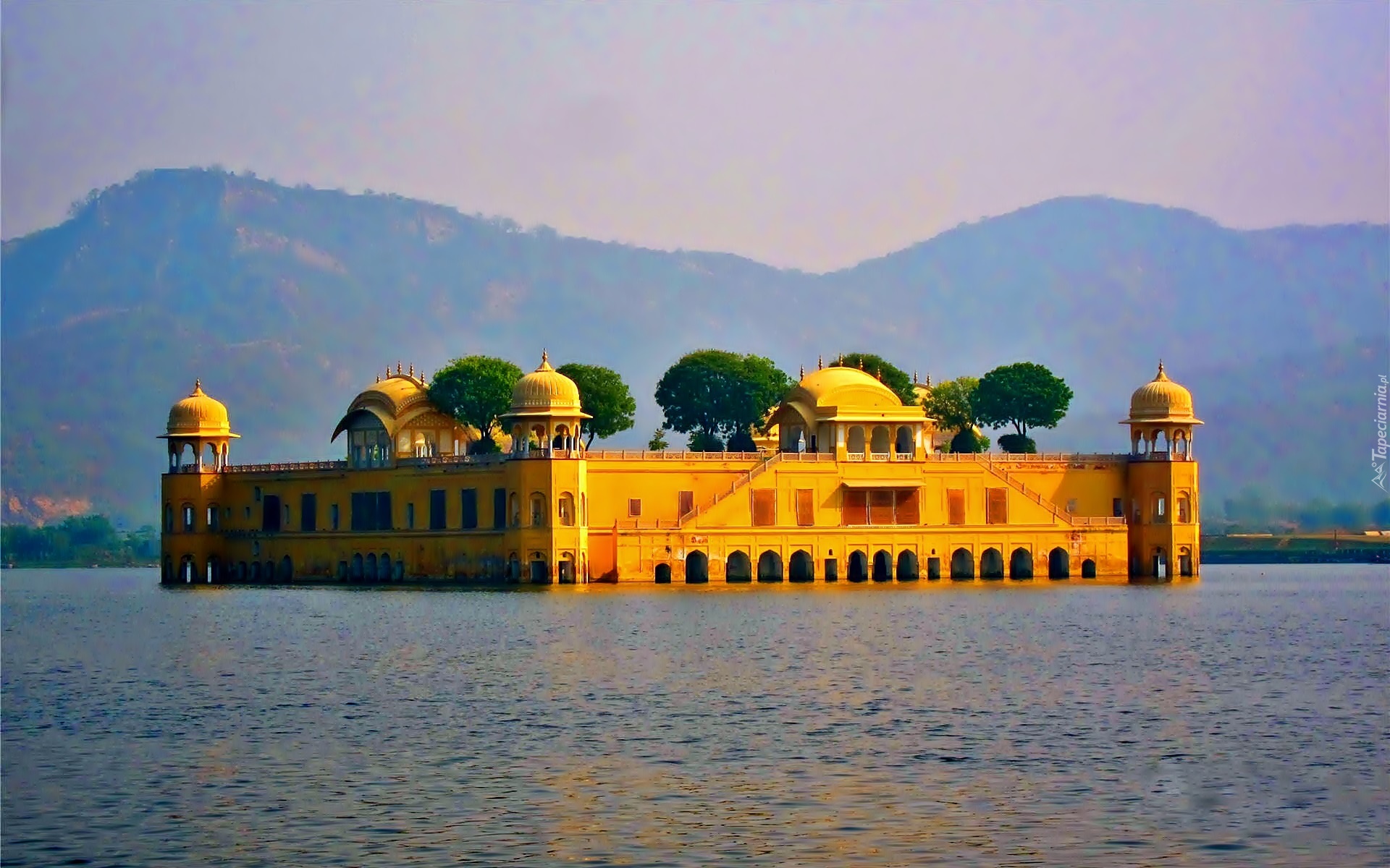 Edytor tapety: Wschód Słońca, Góry, Jezioro, Pałac, Jal Mahal, Jaipur