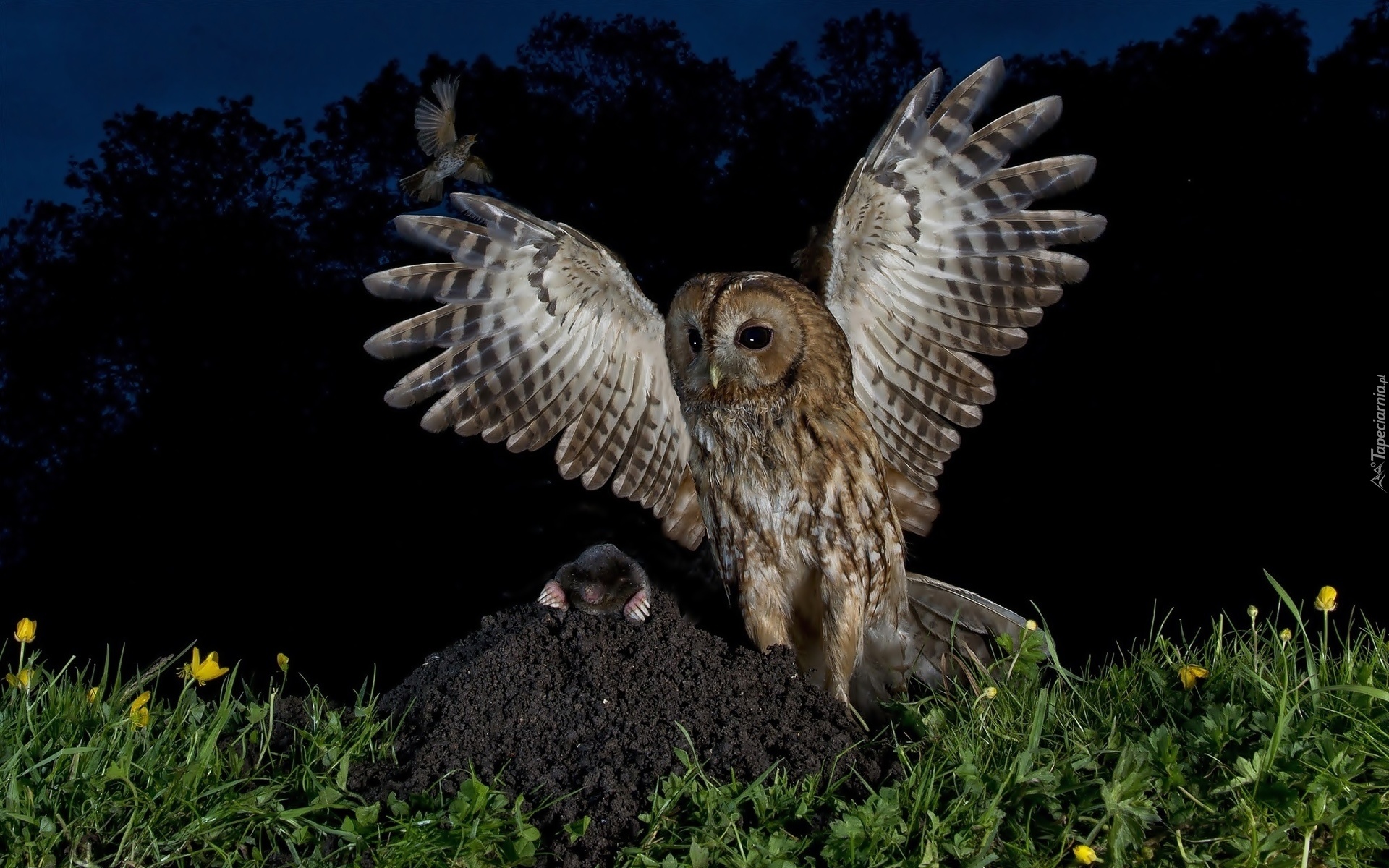 Edytor tapety: Sowa, Kret, Kwiatki, Noc