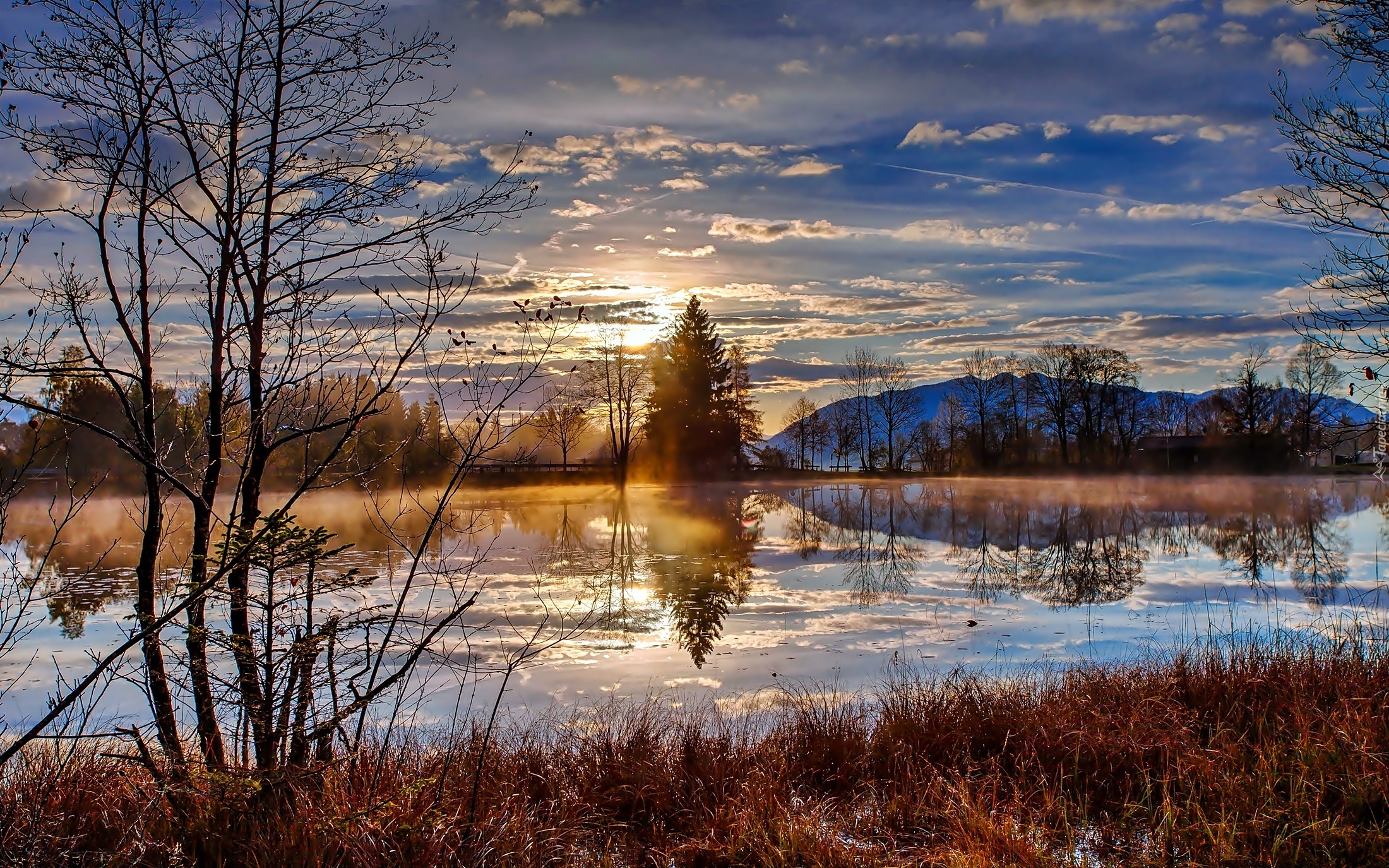 Edytor tapety: Jesień, Jezioro, Drzewa, Chmury, Mgła, Świt