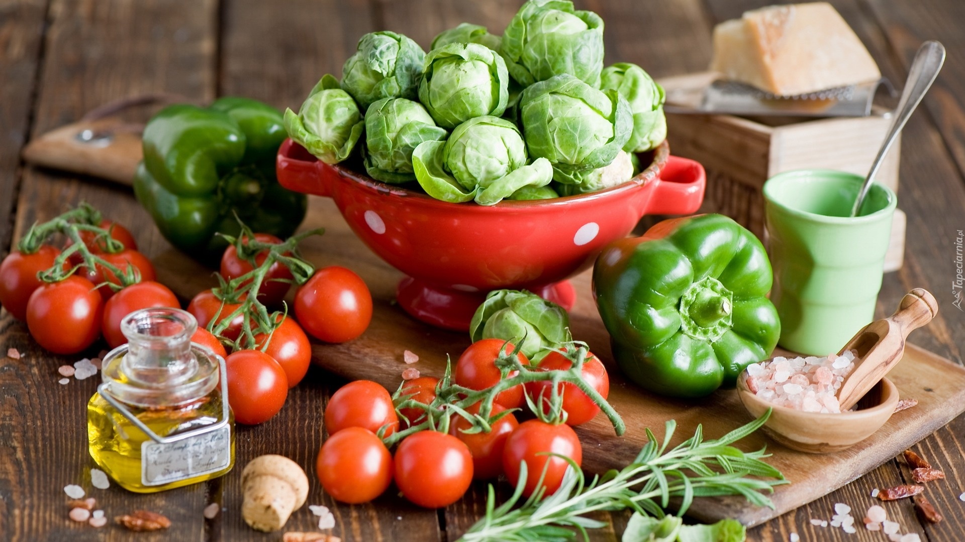 Edytor tapety: Warzywa, Pomidory, Papryka, Brukselka