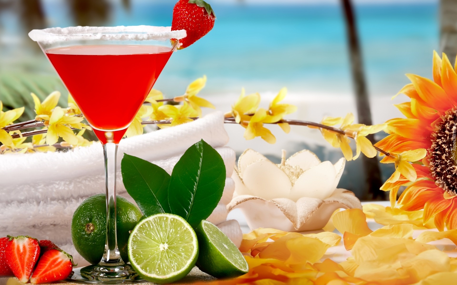 Edytor tapety: Drink, Tropical Cocktail, Owoce, Kwiaty, Morze, Lato