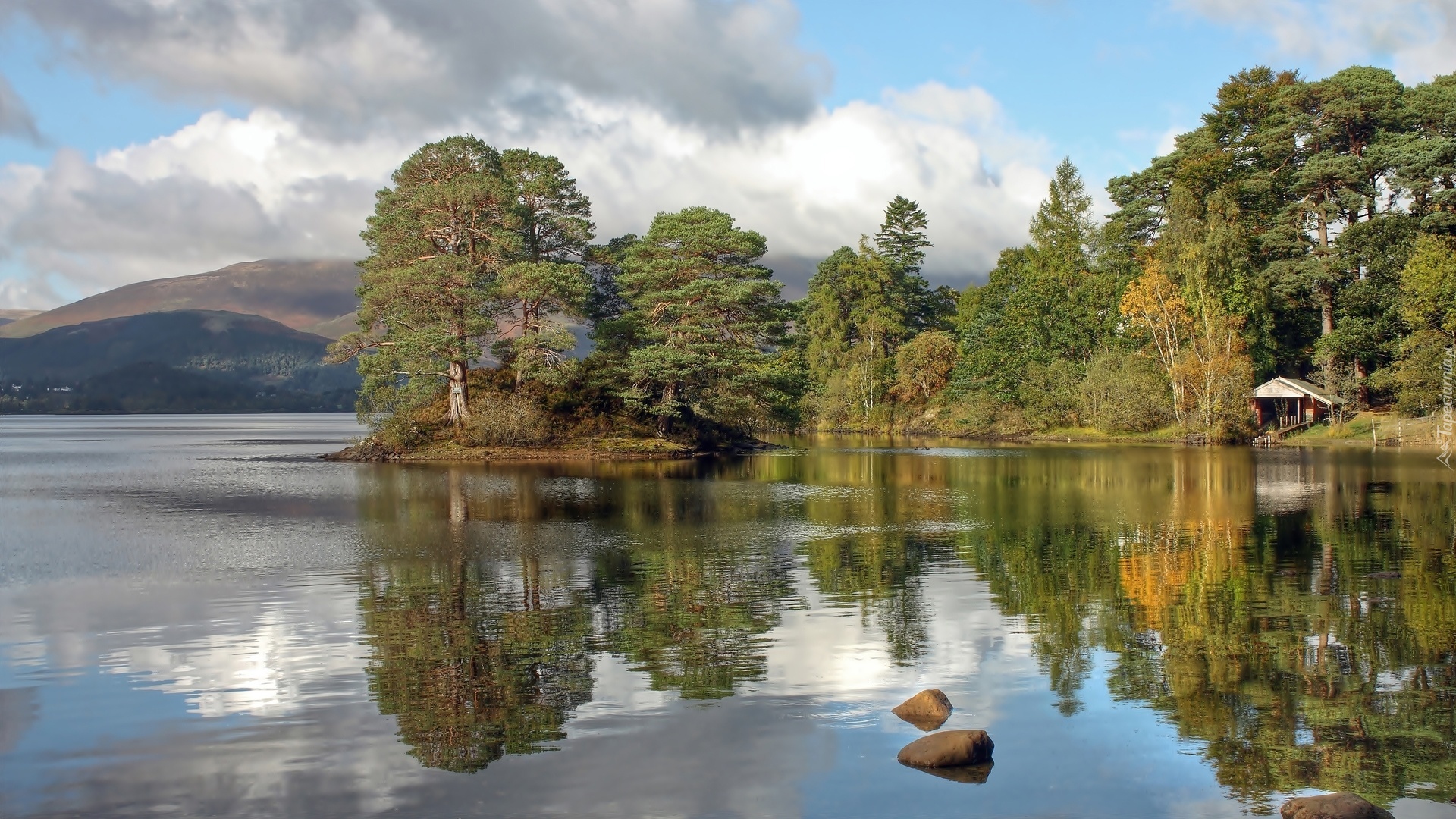 Edytor tapety: Jezioro, Góry, Drzewa, Domek, Letniskowy