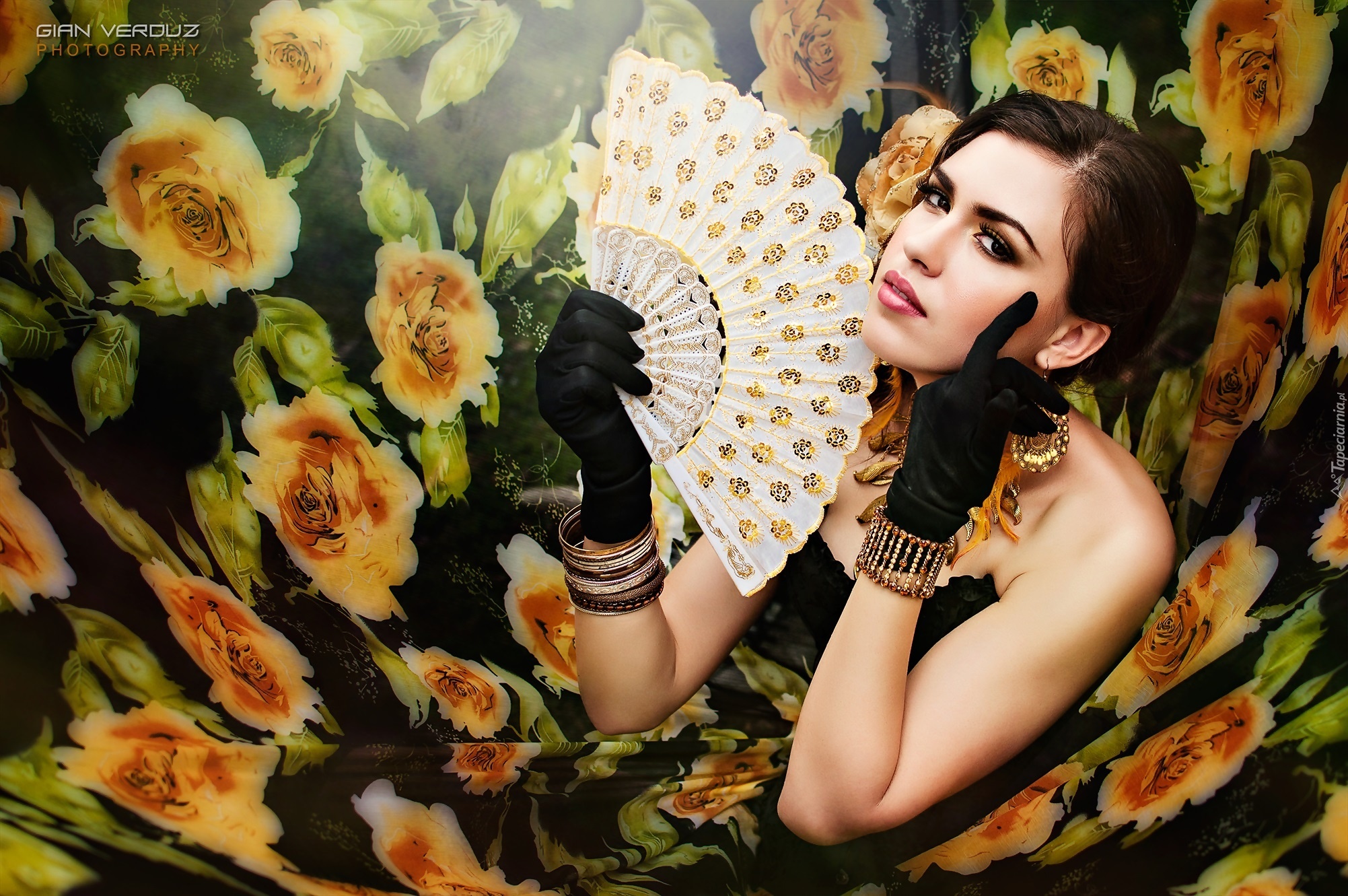 Edytor tapety: Kobieta, Wachlarz, Biżuteria, Kwiaty, Art