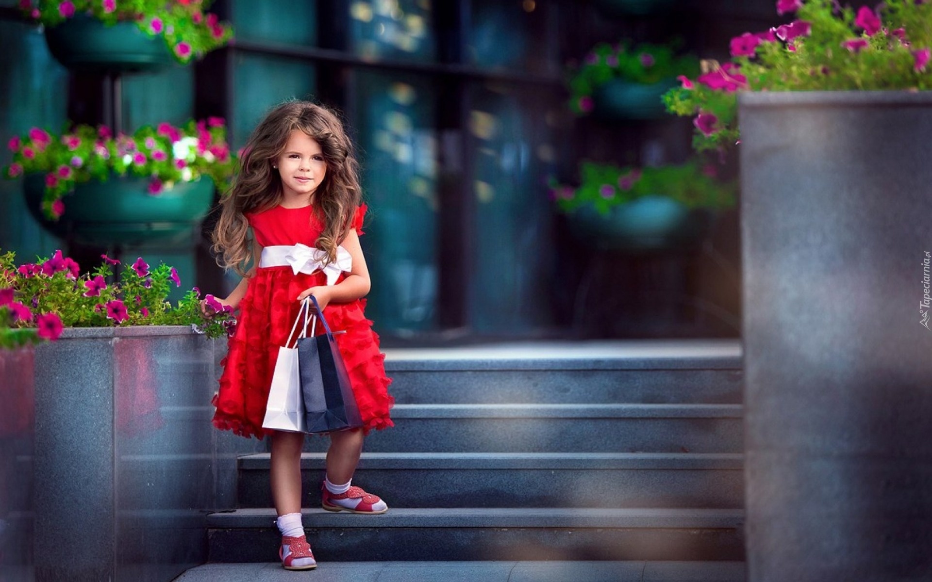 Edytor tapety: Dziewczynka, Sukienka, Torebki, Schody, Kwiaty