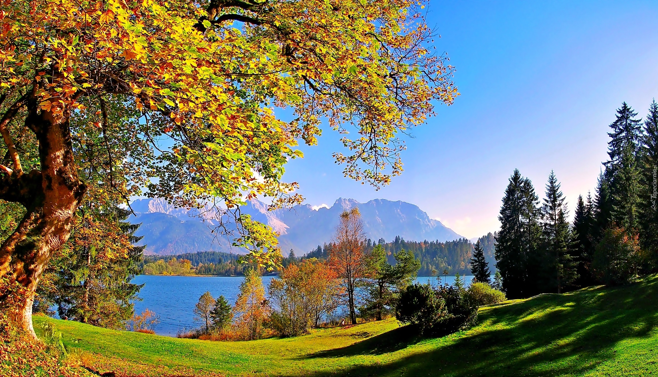 Edytor tapety: Góry, Lasy, Jezioro, Łąka, Drzewa, Jesień, Światło, Cień