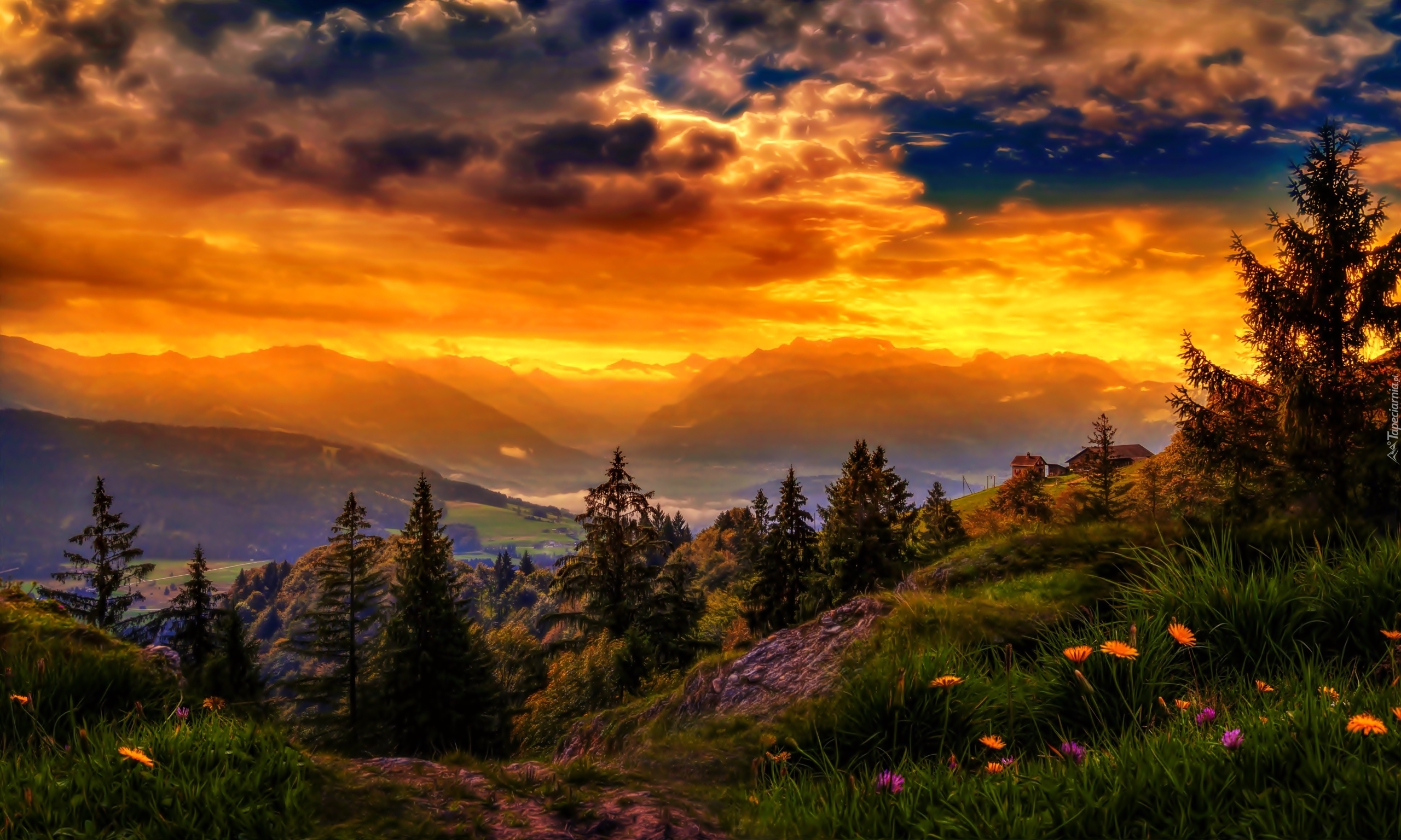 Edytor tapety: Zachód, Słońca, Góry, Drzewa