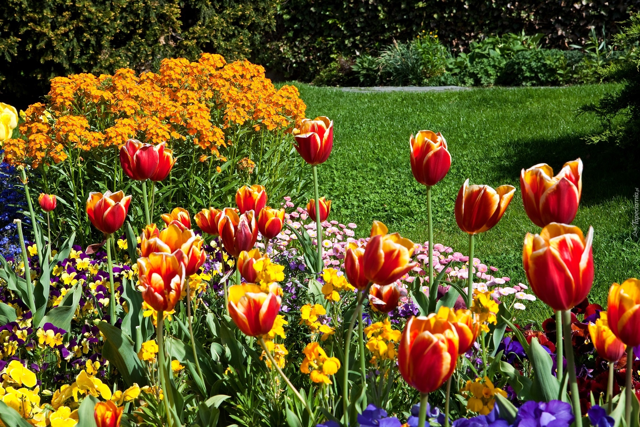 Edytor tapety: Tulipany, Kolorowe, Kwiaty, Trawnik, Park