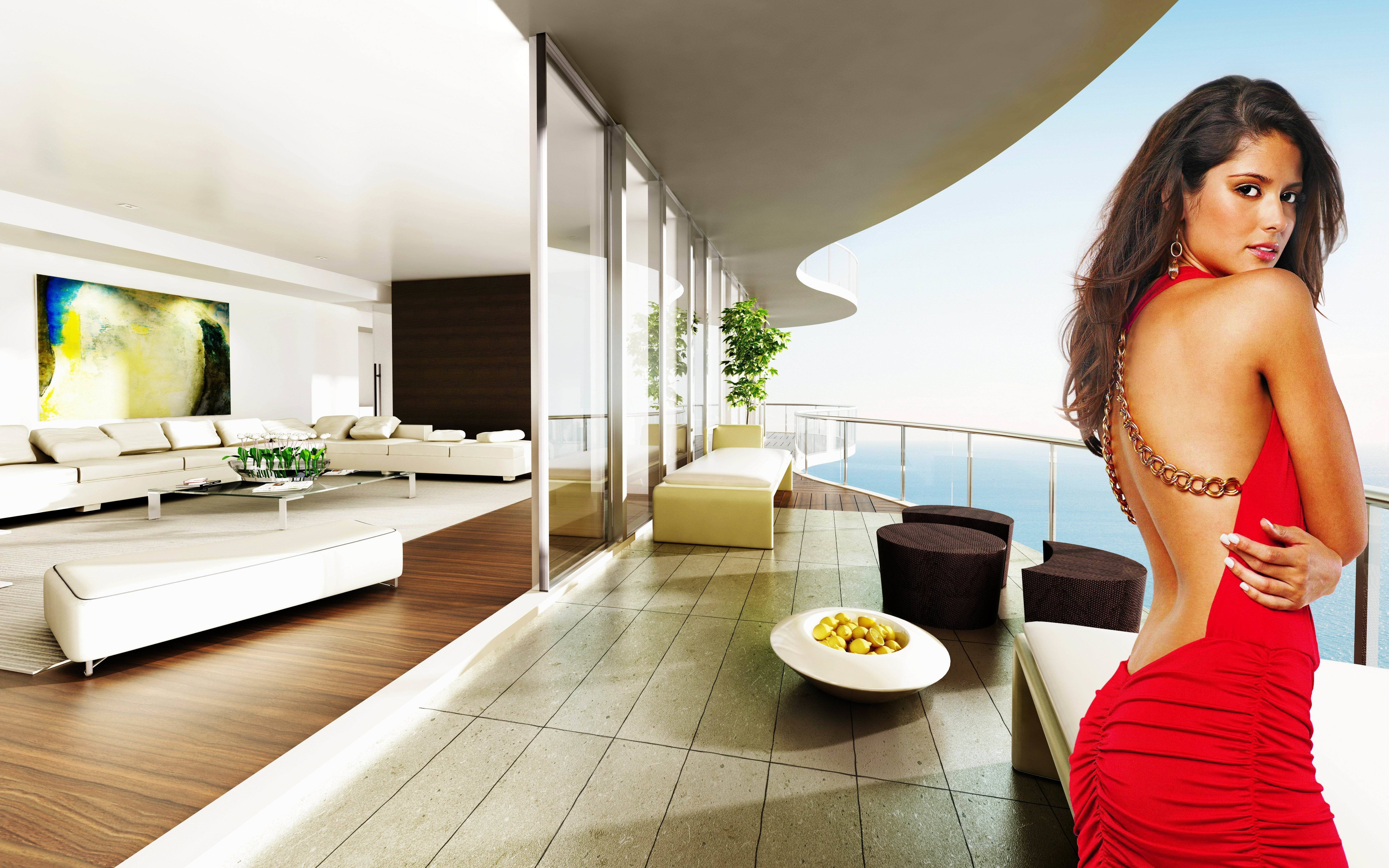 Edytor tapety: Dom, Salon, Balkon, Ładna, Kobieta, Czerwona, Suknia