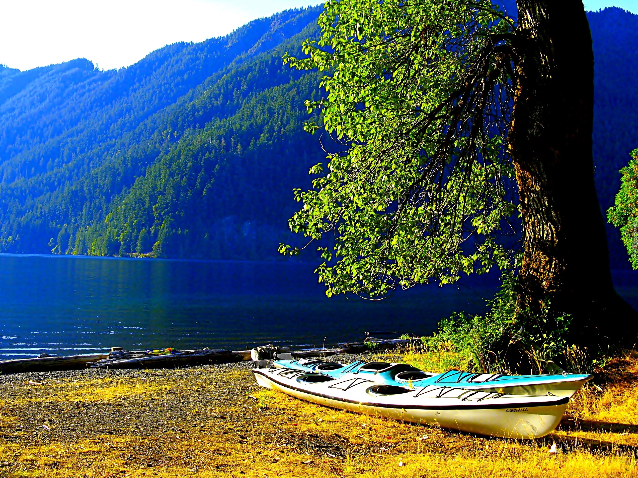 Edytor tapety: Kajaki, Jezioro, Góry, Drzewa