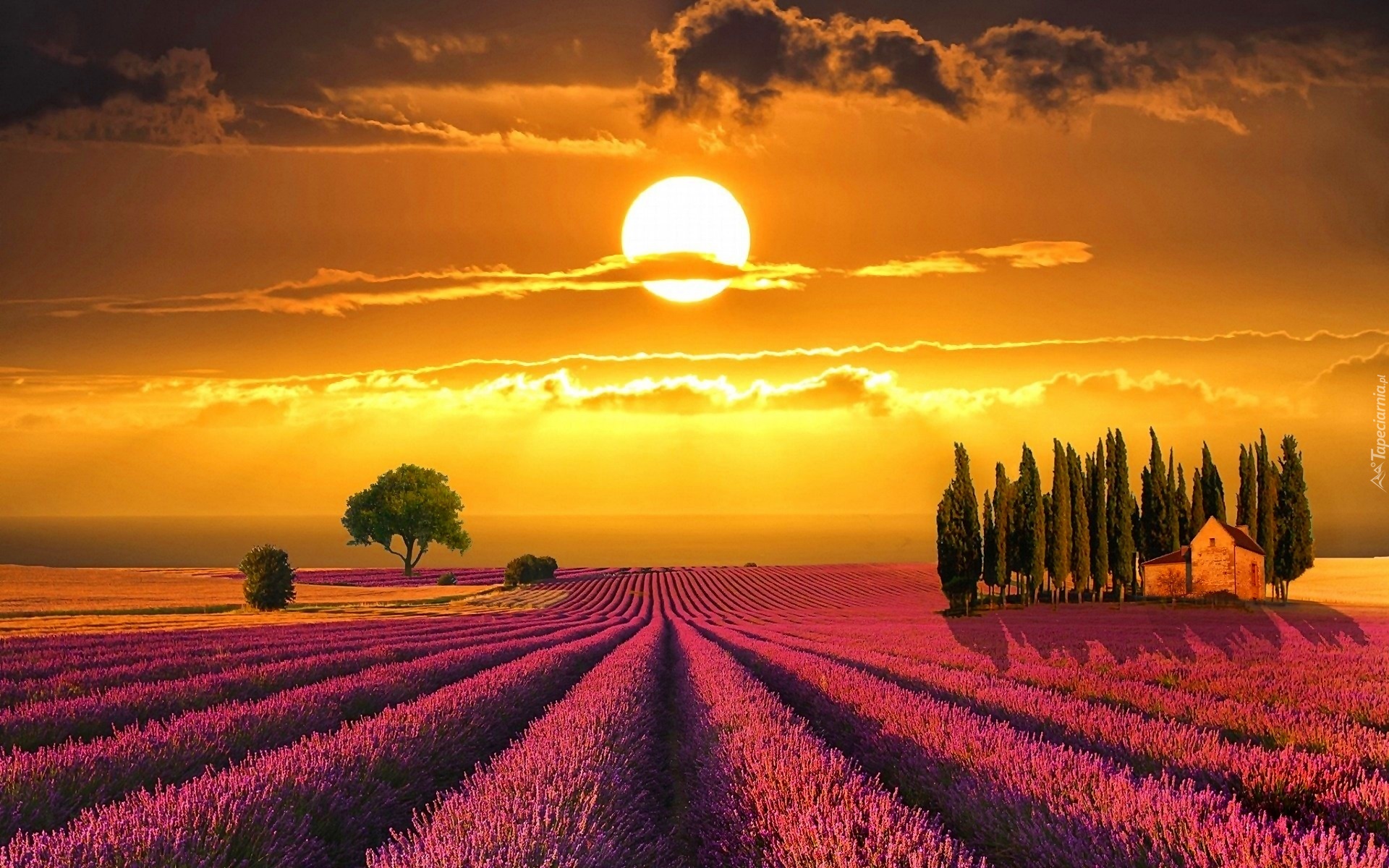 Edytor tapety: Toskania, Włochy, Zachód Słońca, Lawendowe Pole, Dom
