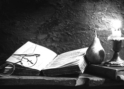 Edytor tapety: Kompozycja, Okulary, Świeca, Książka, Modlitewnik, Gruszka