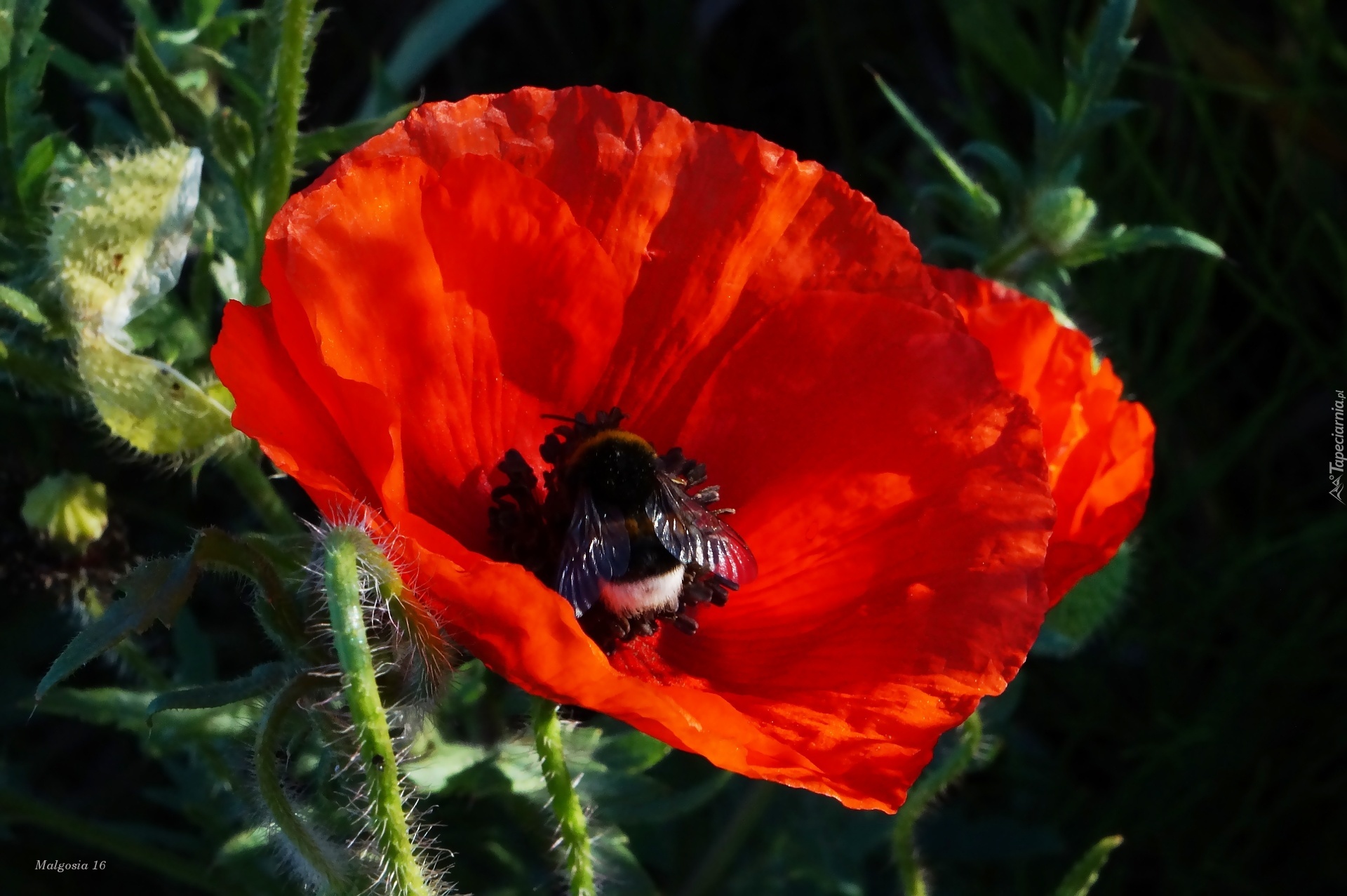 Edytor tapety: Kwiat, Czerwony, Mak, Owad, Trzmiel