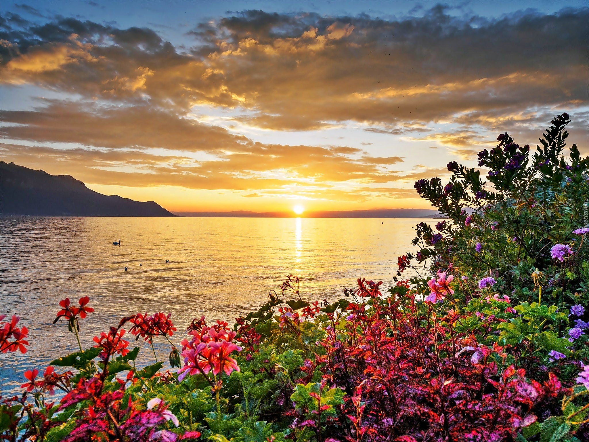 Edytor tapety: Jezioro, Chmury, Wschód, Słońca, Kwiaty