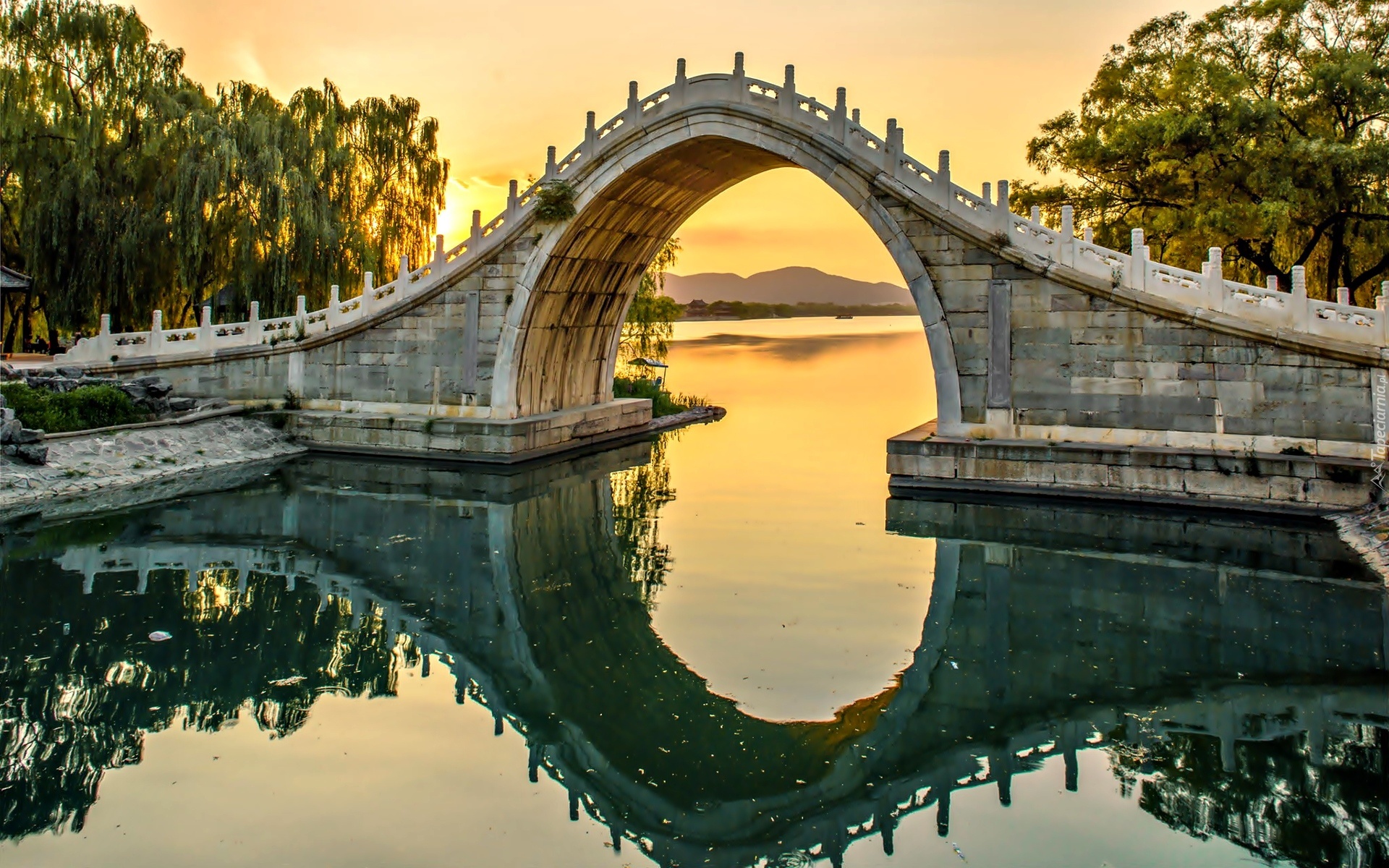 Edytor tapety: Most, Rzeka, Zachód Słońca, Drzewa