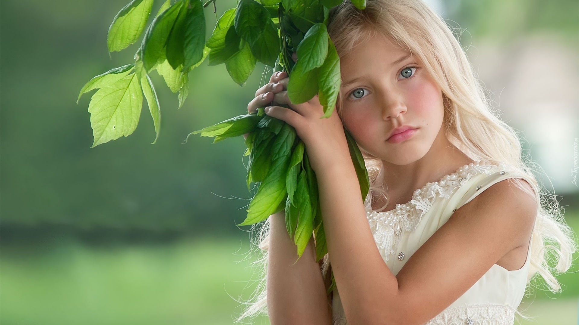 Edytor tapety: Dziewczynka, Blondynka, Niebieskie, Oczy, Liście