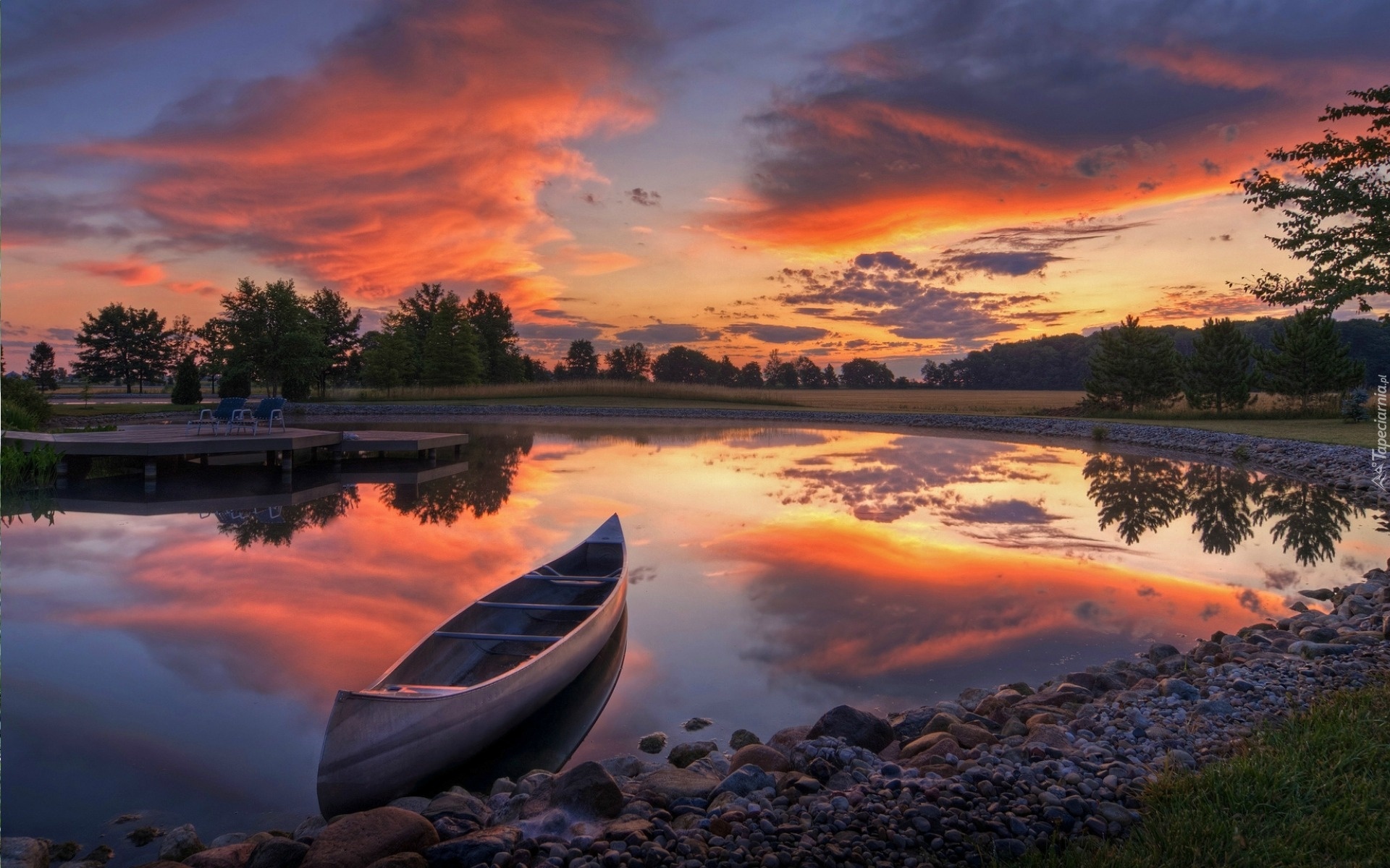Edytor tapety: Łódka, Jeziorko, Drzewa, Zachód, Słońca, Chmury