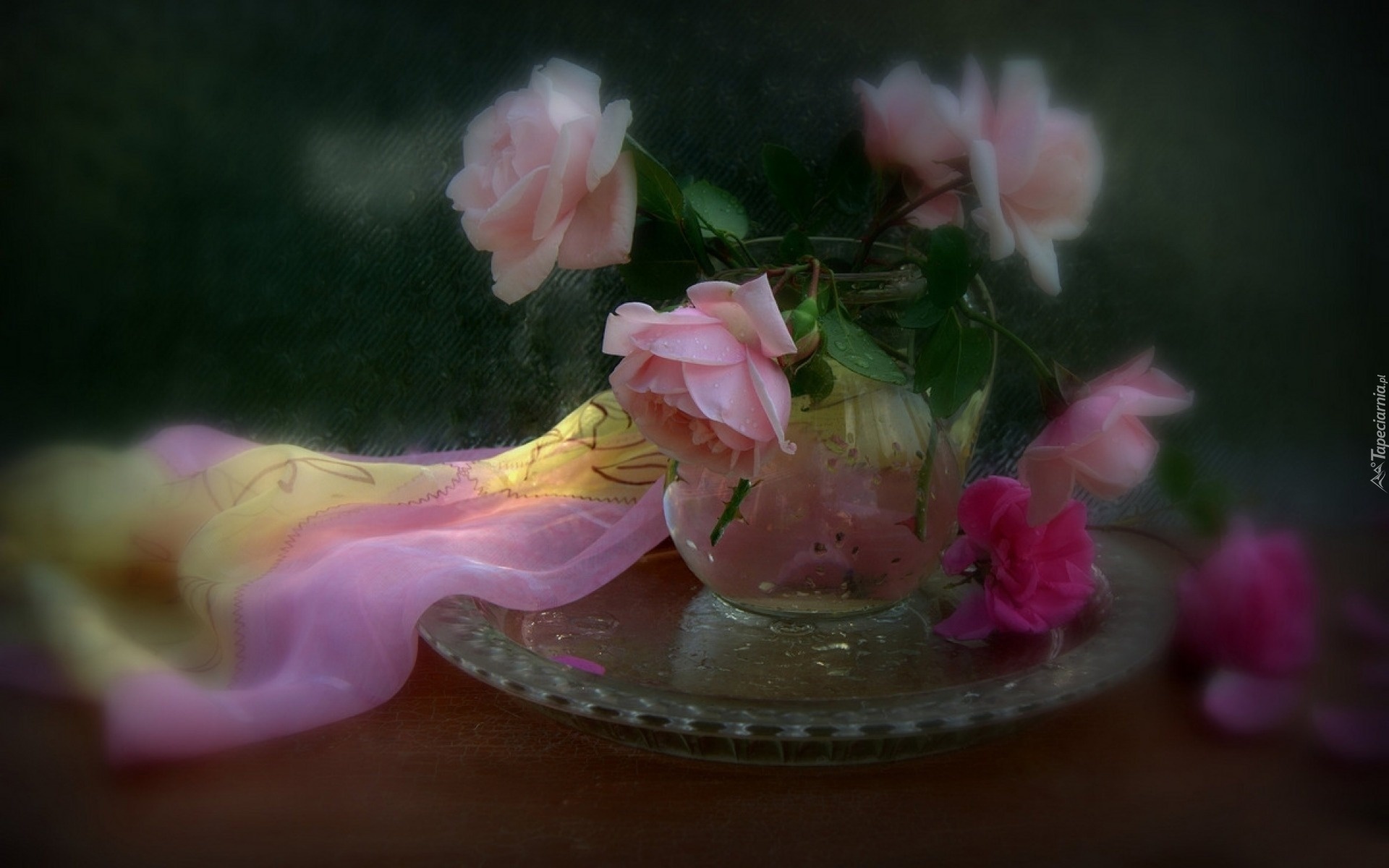 Edytor tapety: Kwiaty, Róże, Wazon, Apaszka, Rozmycie