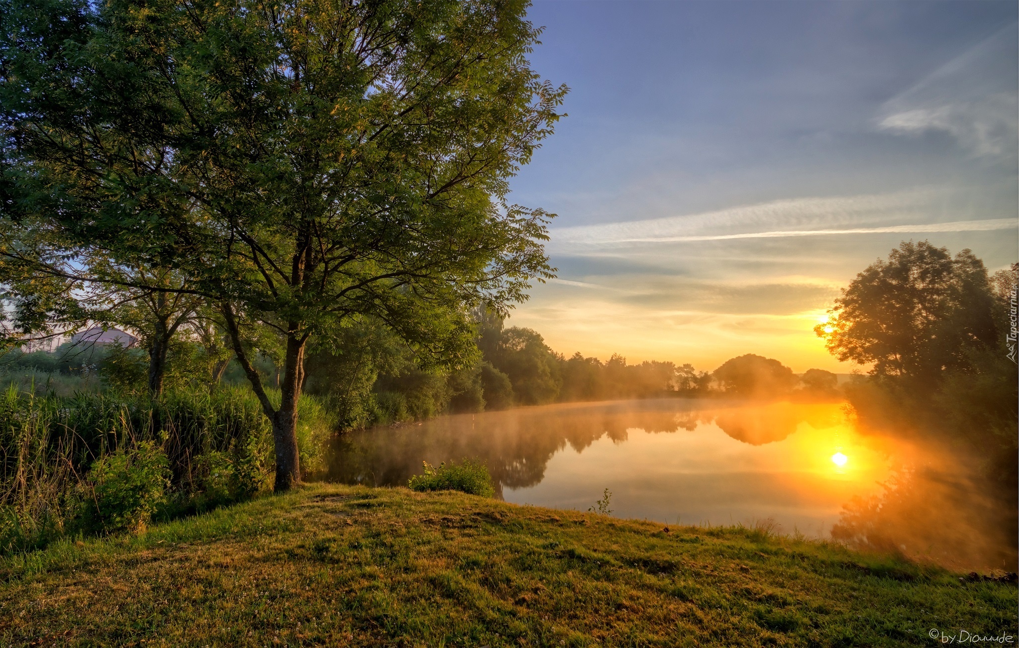 Edytor tapety: Staw, Zachód Słońca, Mgła, Drzewa