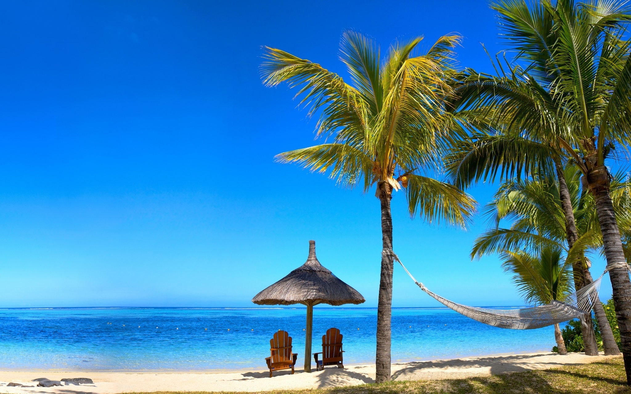 Edytor tapety: Ocean, Plaża, Hamak, Palmy, Tropiki