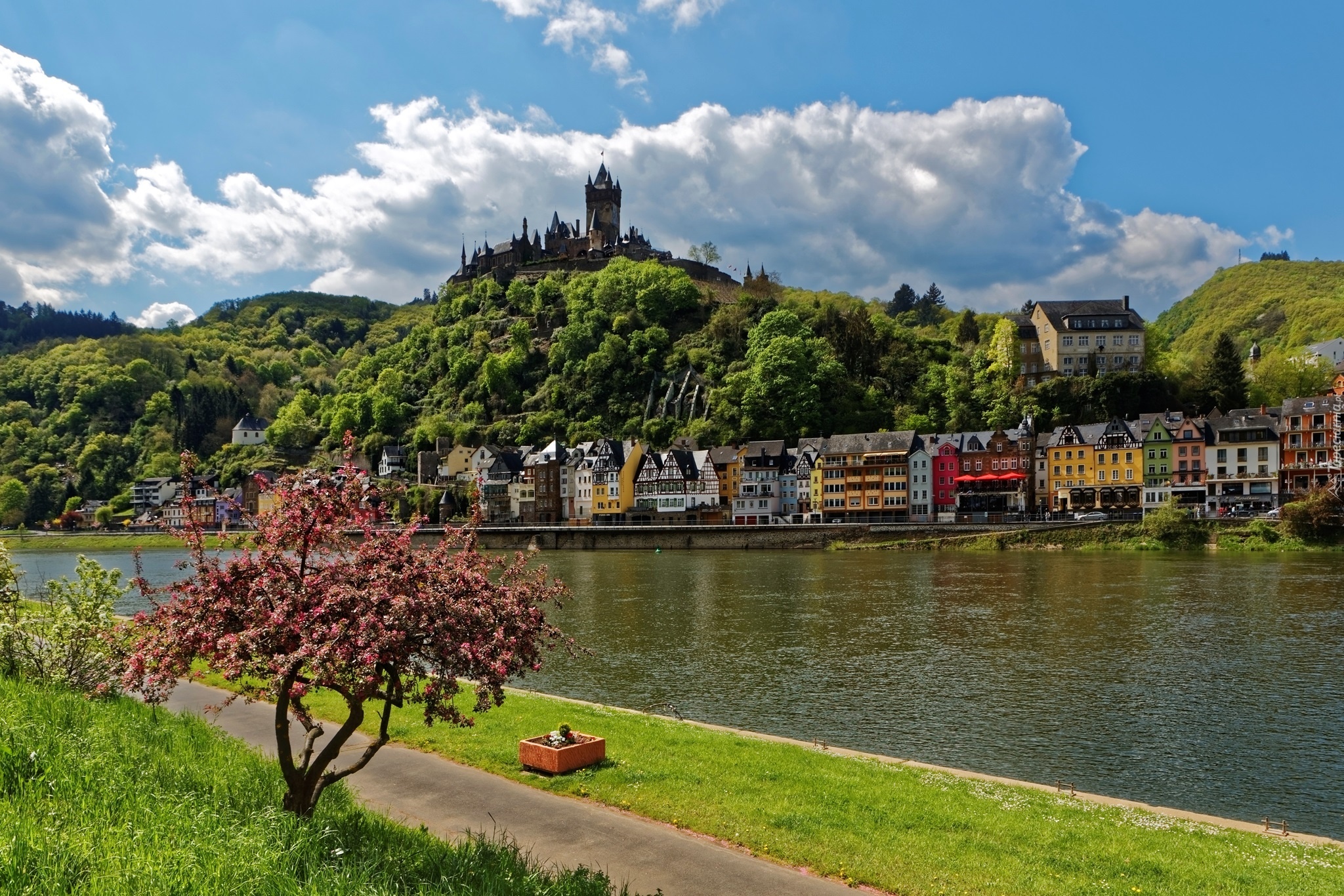 Edytor tapety: Zamek Reichsburg, Miasto Cochem, Niemcy, Rzeka Mozela, Domy, Wiosna